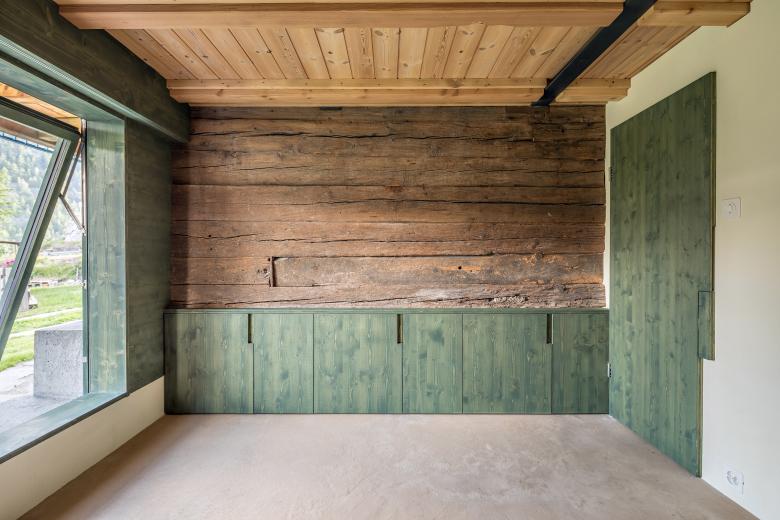 Das historische Chalet der Bauherrschaft liegt inmitten dieses Microkosmos und wurde im Laufe der Jahre mehrfach umgebaut. Im Zuge der Sanierung stand einerseits der respektvolle Umgang mit der historischen Bausubstanz, aber auch eine wirkungsvolle Kombination mit zeitgemässer Architektursprache im Vordergrund. So ist es gelungen, neue und alte Bauteile effektvoll zu einem gemeinsamen Ganzen zu fügen und dem ehrwürdigen Chalet ein frisches aber dennoch selbstverständliches Erscheinungsbild zu verleihen. Der spielerische Umgang mit Farbigkeit und Materialität trägt dazu bei, bestehende und neue Bauteile deutlich ablesbar zu machen. Neue Fensteröffnungen sind zudem präzise gesetzt und lassen die einmalige Landschaft Teil des Chalets werden.