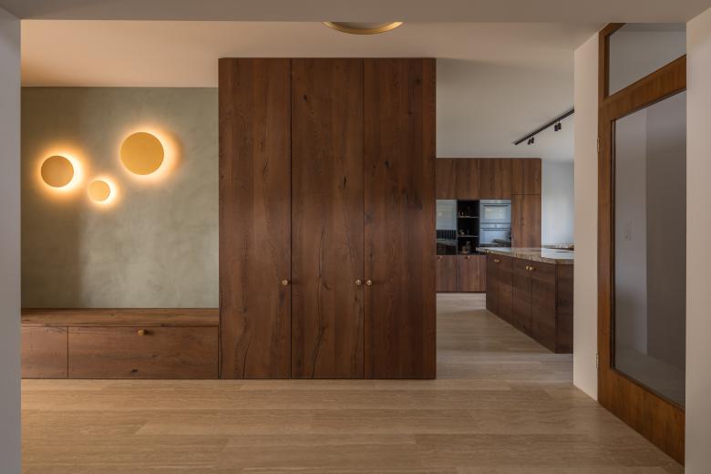 Bei der inneren Materialisierung der Oberflächen wurde ebenfalls an die klassische und hochwertige Eleganz des Bestandes angeknüpft. Travertin für die Böden in der Eingangshalle, der Küche sowie den Bädern. Alle Schreinerarbeiten sind mit einem geölten Eichenholzfurnier ausgeführt und werden mit einem Eichenparkett in der gleichen Farbe im Dachgeschoss ergänzt.