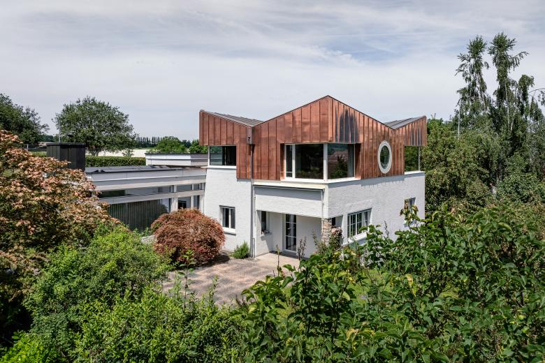 Das Dachgeschoss knüpft mit der neuen Kupferverkleidung von Dach und Fassade an die bestehende Materialisierung an. Zuerst noch leuchtend wird sich das Kupfer mit der Zeit abdunkeln und unaufgeregt in die umgebende Dachlandschaft integrieren.