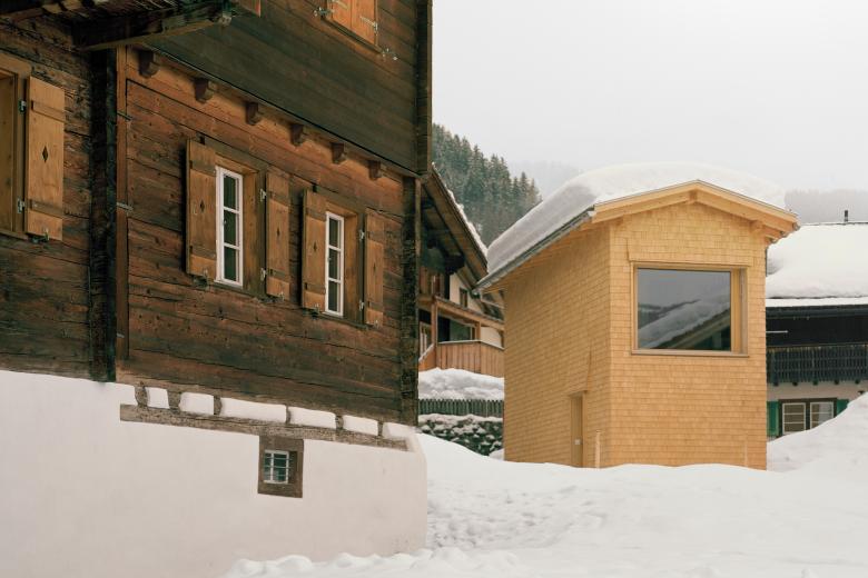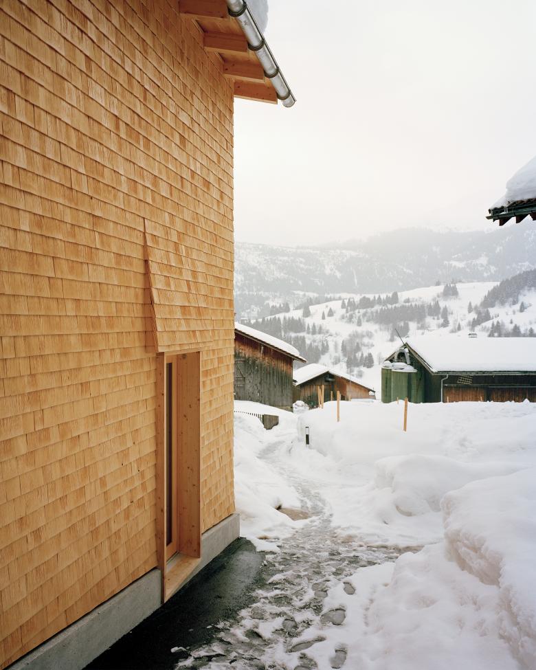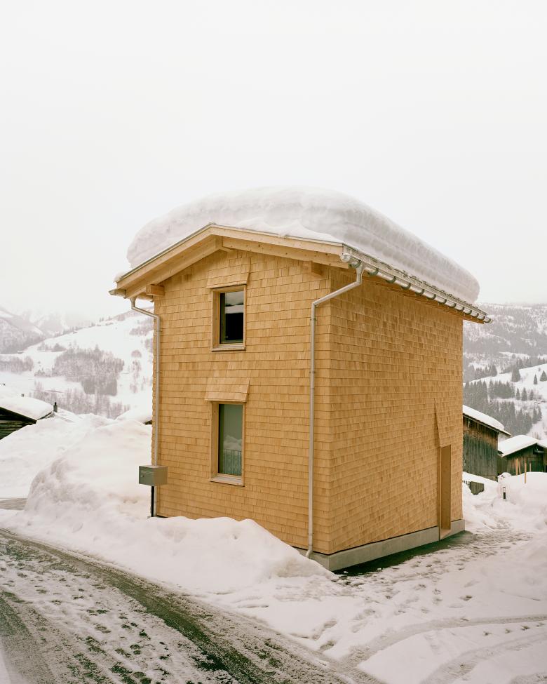 Die Schindeln aus einheimischer Fichte bekleiden das gesamte Gebäude und binden es in den historischen Dorfkern mit ein. Die sichtbaren Sparren und das simple Blechdach erinnern an den ehemaligen Stall. Die geschliffene Betonwanne ragt über das Terrain und über die Fassade hinaus und schützt die Schindeln vor Fahrzeugen und Beschädigungen. Dank des kleinen Grundstücks und des geringen Gebäudevolumens konnte ein Einfamilienhaus zum Preis einer Kleinwohnung entstehen.