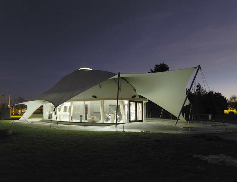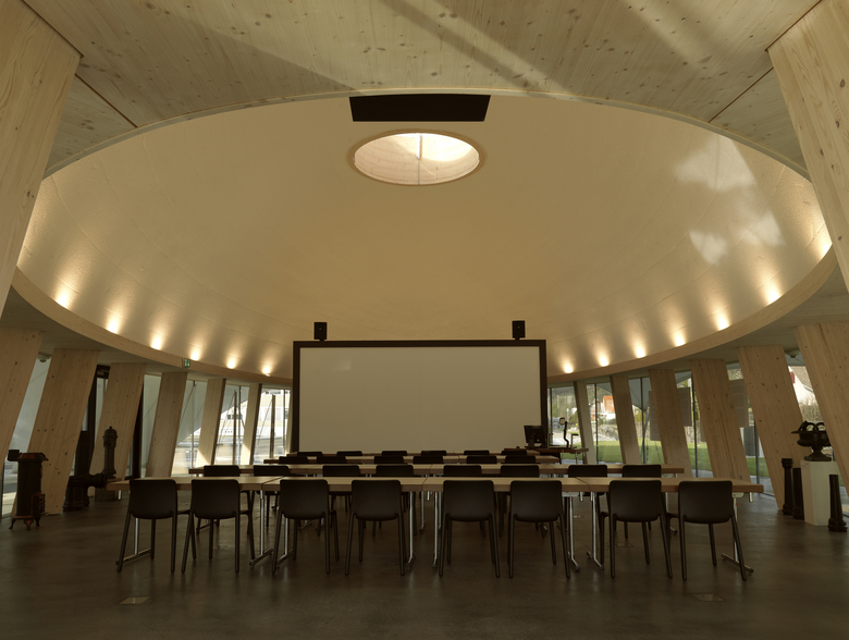 Lösung hierfür ist eine Membrankonstruktion, die weit über die elliptische Strohkuppel gestülpt ist. Wie ein freundlicher Ausserirdischer "Friendly Alien", bettet sie sich in den diffusen Siedlungsteppich ein. Die Membran bildet interessante überdeckte Aussenräume, die Platz geben für die Schulung an den Hydranten sowie einen Rundgang über die Gussdeckel ermöglicht. Optisch gliedert sich der Aussenraum durch ein rundumlaufendes Fensterband an den Innenraum an. Die Holzstützen der mit Stroh gedämmten Kuppel zeichnen durch ihren Verlauf die Ellipse nach. Der Innenraum wird von der Kuppel dominiert, einzig ein schwarzer Kubus steht frei untergeordnet im Raum und birgt alle technischen Installationen sowie Toiletten und Teeküche. An der höchsten Stelle gibt ein rundes Oblicht von 3m Durchmesser den Blick auf den Himmel frei und sorgt bei Öffnung für angenehme Belüftung. Die Plattform bildet eine rohe Betonplatte mit Besenstrich. Im Innenraum wird dieser durch Schliff und Wachsung einen Tick edler. Das weisse Tuch der Membran wird im Innenraum durch einen feinen wei-chen Baumwollputz wieder aufgegriffen. Der schwarze Kubus besteht aus schwarzen, gewachsten und matt schimmernden Holzfaserplatten. Im Inneren des Kubus leuchten die Wände anmutig warm orange.