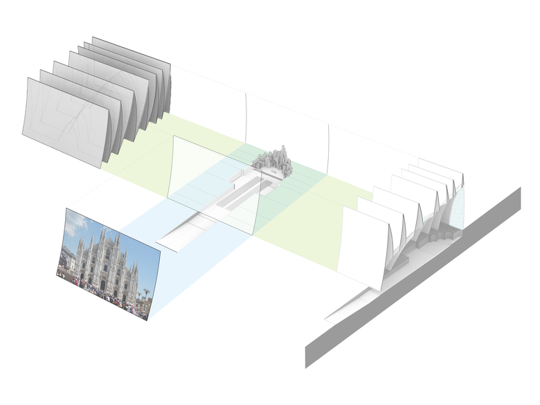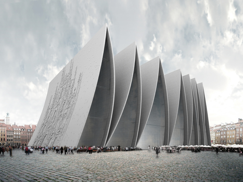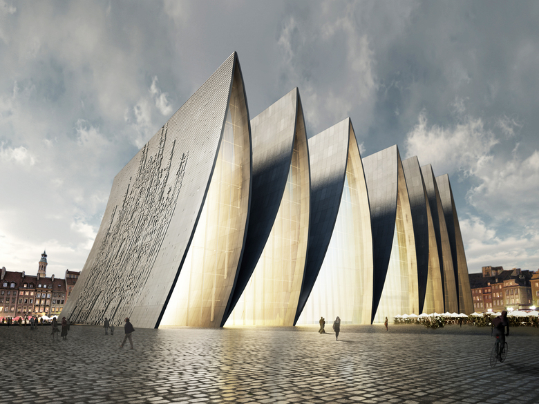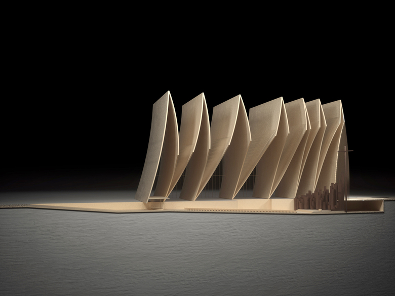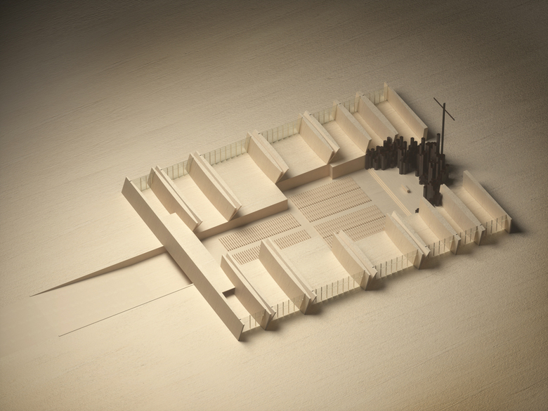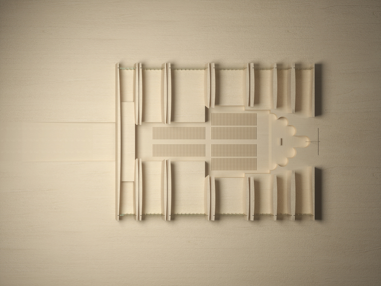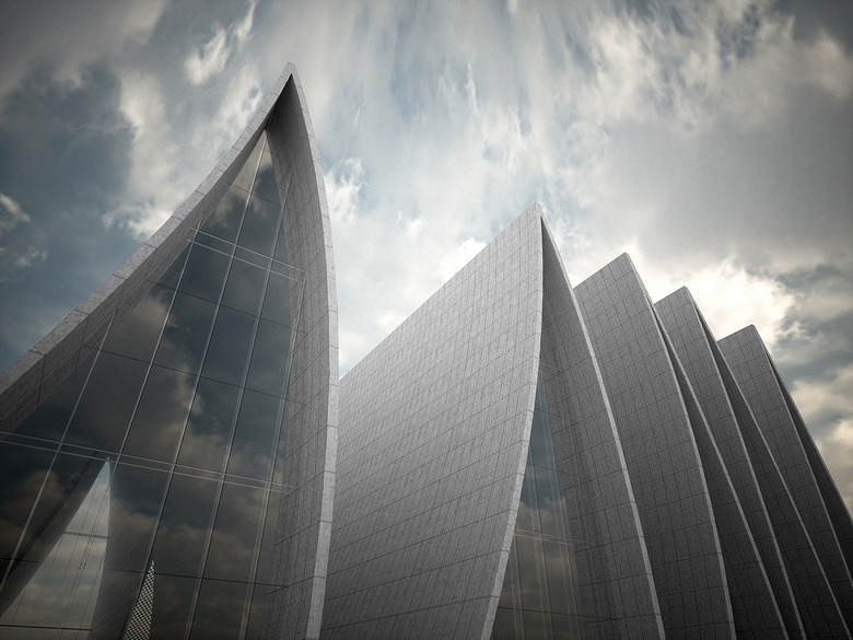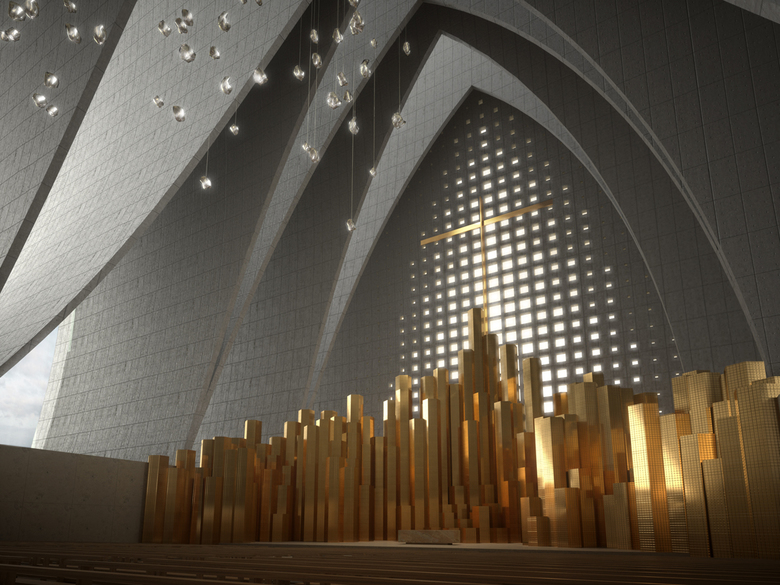 For the faithful, the centuries-old foundation of the world’s great religions is a powerful symbol. Staying vibrant, however, means also viewing that ancient tradition through a contemporary prism. That was the aim of Axis Mundi’s proposal for a new cathedral in Strasbourg, France. The foundation, submerged below ground, represents the  Latin cross plan of historic cathedrals: a long nave intercepted by a transept. The façade also evokes Gothic cathedrals with a digitized bas relief depicting abstracted arches, towers and tracery that become more visible as the sun casts shadows on its limestone surface. Behind that façade, however, the familiar arches and groin vaults are replaced with a progression of slanted accordion folds conceived on the soaring scale of Europe’s famously inspiring basilicas. Glass walls between the folds invite in floods of glorious light, which come to rest on a dramatically minimalist altar and pulpit inspired by the basalt columns of Giants Causeway in Northern Ireland. Rising from it is a pure, unadorned bronze interpretation of Christianity’s most enduring emblem: the cross.
