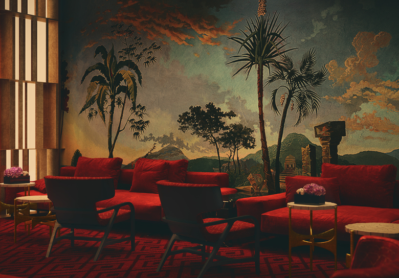 Past the main bar area, the lounge provides an alternative drinking environment. Equipped with low red velvet sofas, David Hicks inspired patterns, and a 19th century fantasy-scape mural offers a visual, imaginative escape and enchanting scene for exclusive groups.