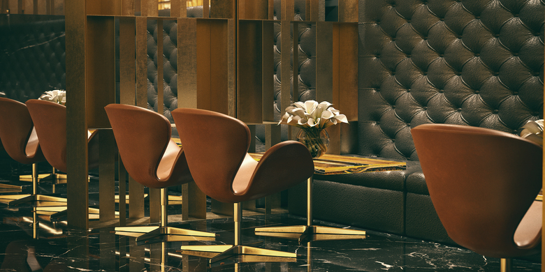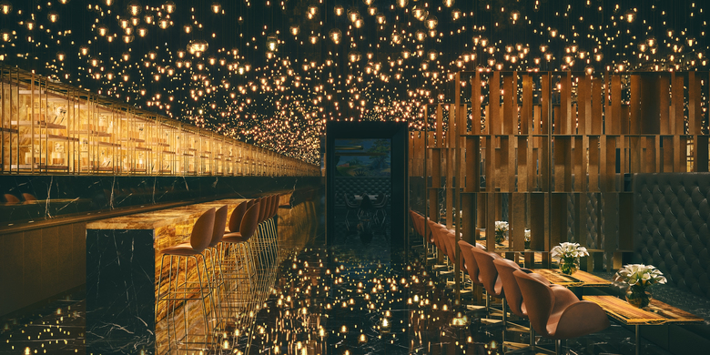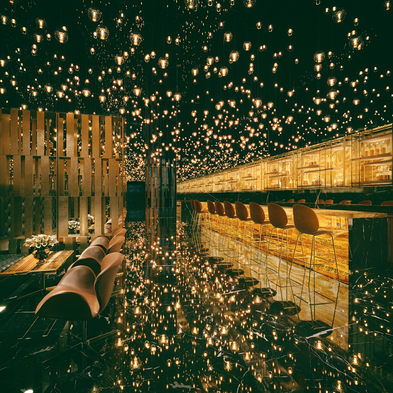 Lux Astralis is an exclusive, high-end tequila bar in New York City. Inspired by the infinity rooms by artist Yayoi Kusama, the ceiling, walls and floors of the main bar area are clad in mirror and black marble, reflecting the soft light of the Bocci pendants. Featuring a long bar of glowing back lite onyx and small tables, divided by elegant brass dividers, guests are welcomed to sample their tequila in this glamorous, celestial atmosphere.