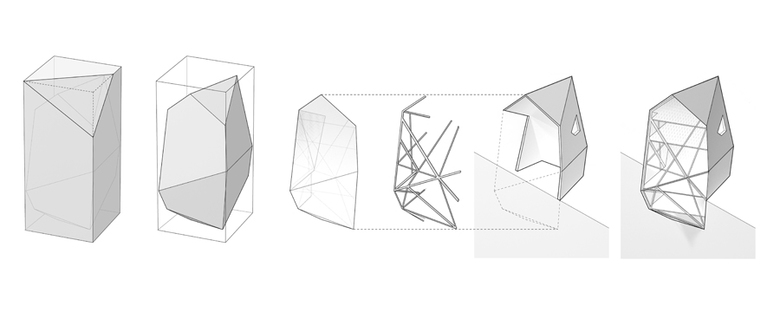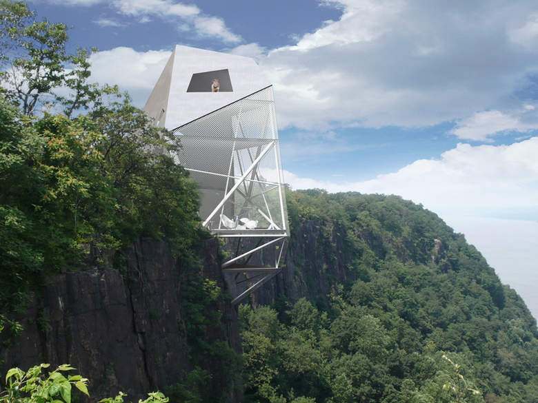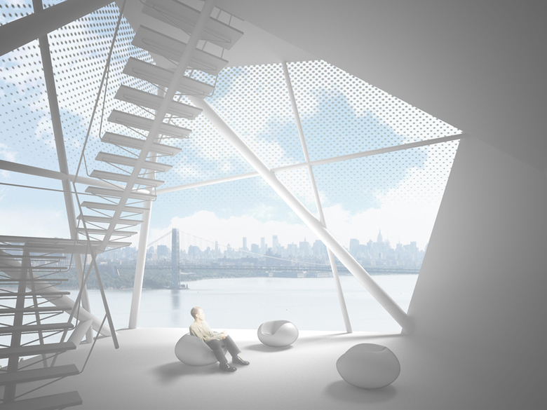 Axis Mundi’s proposal for this residence envisages a mammoth crystalline boulder protruding from the dramatic escarpment of the Palisades like a rock crystal emerging out of an implacable basalt matrix. Shooting vertiginously upward from the Hudson River and extending from Newark, New Jersey in the south to Nyack, New York in the north, this remarkable geological feature commands unparalleled views of Manhattan, the George Washington Bridge and the rolling hills abutting the river to the north. Beginning with a rectangular vertical shape drawn from the many viewing towers dotting the riverfront, the form is then pushed and pulled out in parts, resulting in what appears to be a bulbous, faceted outgrowth from the cliffs. These moves are dependent on desired framing of certain views, the sun’s path across the sky and topological considerations. The final form is a glass-sheathed polyhedron with main living spaces—kitchen, dining and living room—on the entry floor and bedrooms accessed by a floating stairway on the upper floors.
