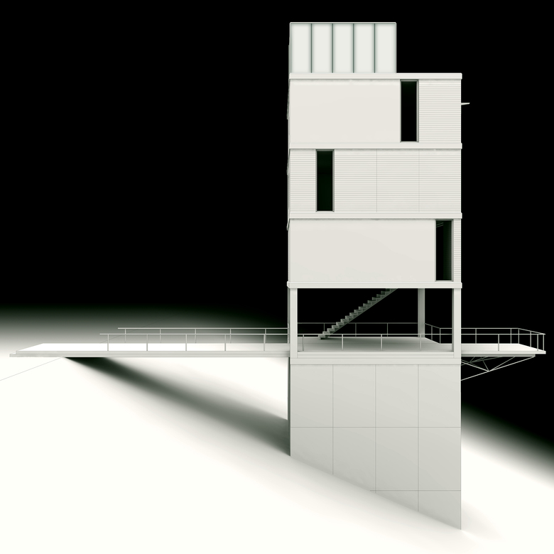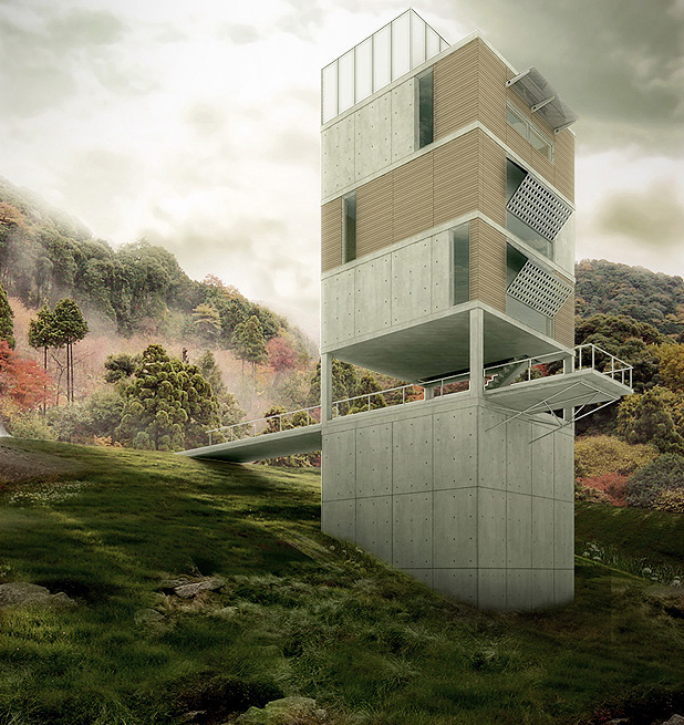European gardens of the 18th and 19th centuries boasted architectural follies that mimicked Greek temple ruins, Chinese pagodas, Egyptian pyramids and other buildings. They were intended to make connections to the virtues of classical antiquity, travels to exotic lands and other evidence of one’s sophistication and breeding. This house adopts the idea intriguingly by excising pretense and frivolity to devise a unique solution to the steeply sloping topography of this site in Smuggler’s Nest, Vermont. An urban townhouse references a link between city and country living. A long bridge imparts a sense of procession and arrival, culminating in a cantilevered viewing platform. Stairs ascend to the kitchen and dining area, then to the second-floor living area, then to the master bedroom and bath. The roof’s open-air garden features striking 360-degree views of the land. As the house ages, vines descending from here will shroud the house in leafy cover, giving the structure the appearance of a modernist ruin—a large folly situated in an exceptionally large garden