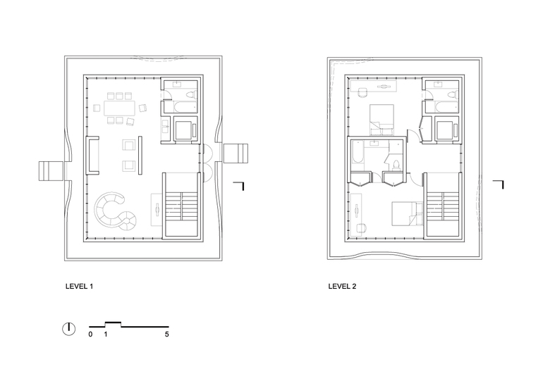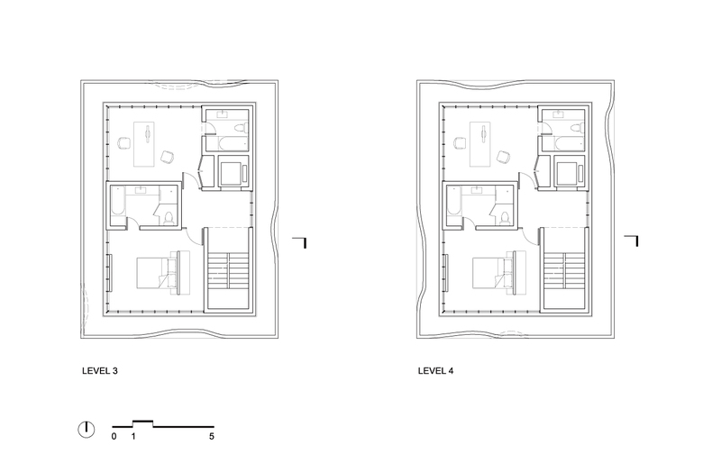 The Number Four “Blockhouse” sits on a particularly valley site, nestling the house into the landscape. In the spirit of a pagoda, four cubic floors are stacked vertically, allowing for minimal site excavation and land use. The ground floor features living and dining spaces quietly enveloped in the surrounding forest and overlooking a stream, and a communal roof terrace rises to just above the trees. The roof merges into the landscape as another living space, complete with pool and wooden deck within the panorama of the forest. The geometric shape is sculpted from concrete and finished in a white protection surface.