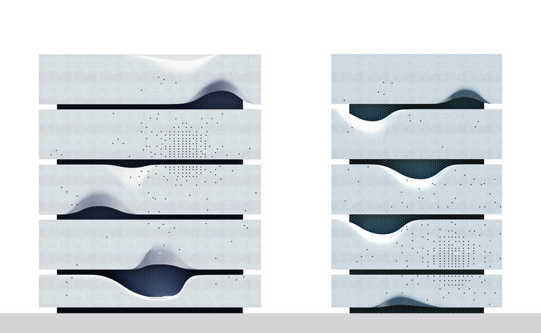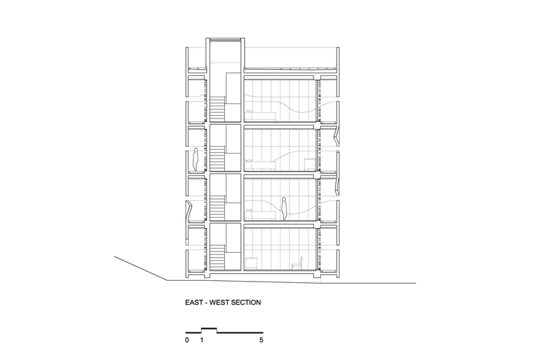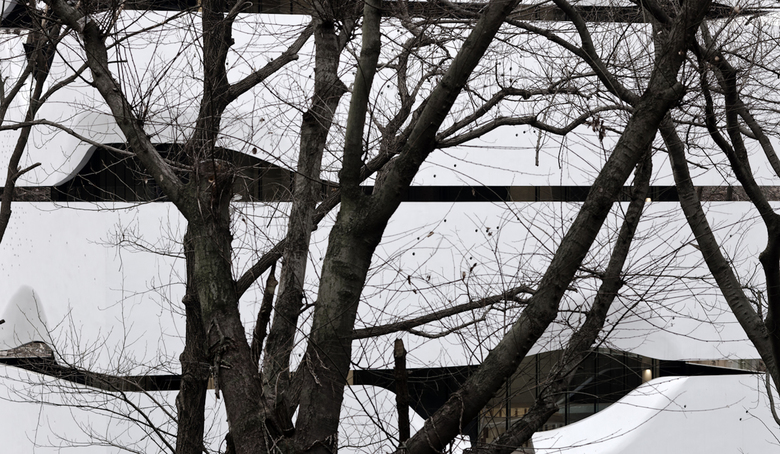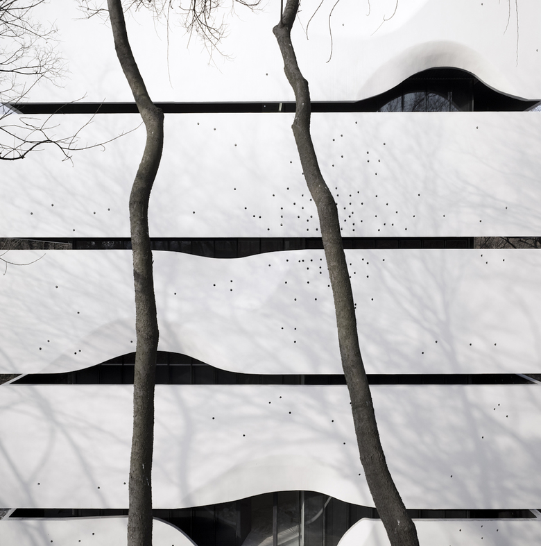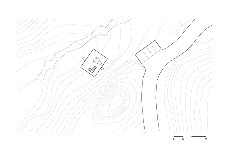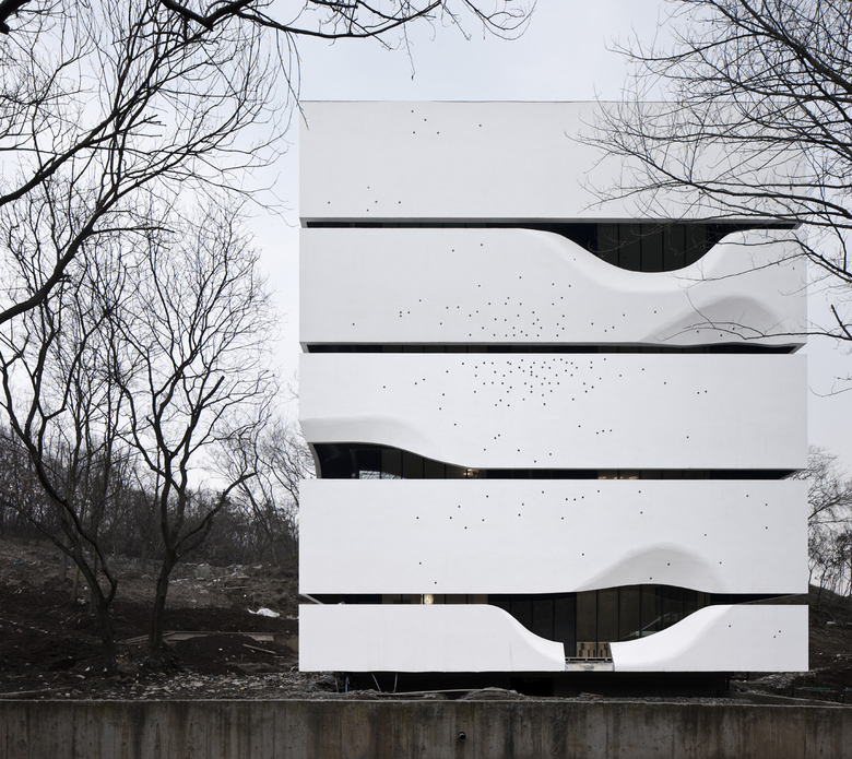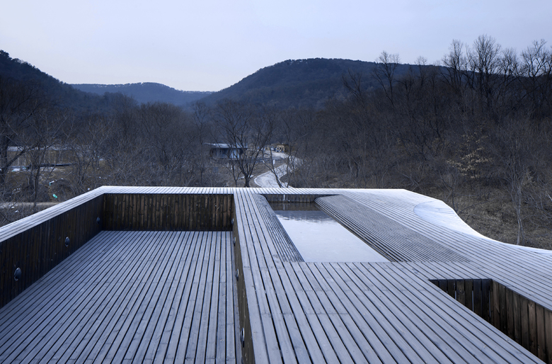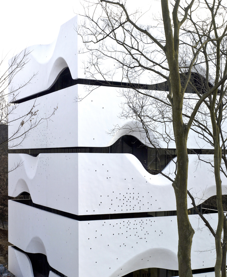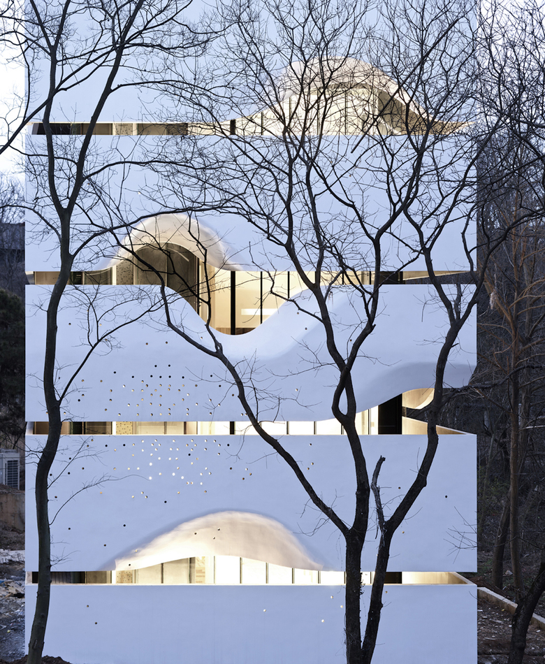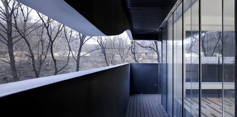 The concept of Blockhouse is almost the living attitude of many Chinese: a minimal opening to the surrounding landscape is the only perforation of the richness inside the house. The horizontal break of each floor—in combination with larger unique curved apertures on each floor—frame vistas in the spirit of Chinese landscape scrolls. Prescribed views have a long tradition in Chinese art history and traditional Chinese gardens, designed to make the viewer reconsider and contemplate the landscape.