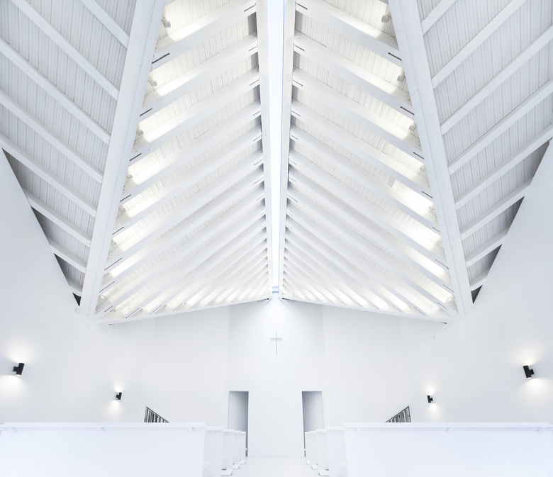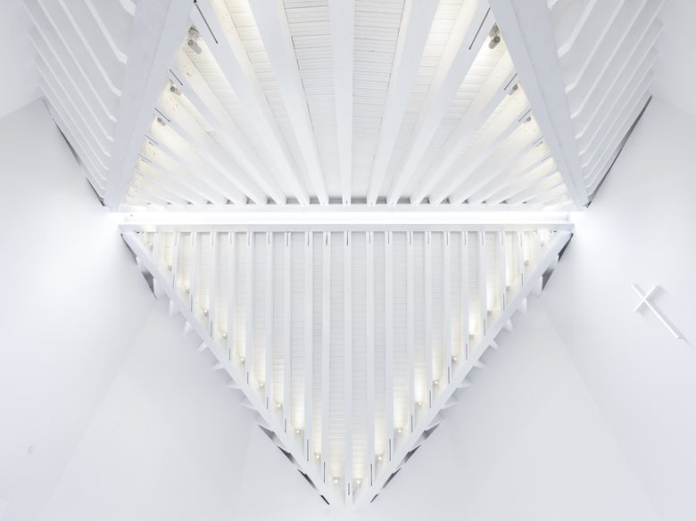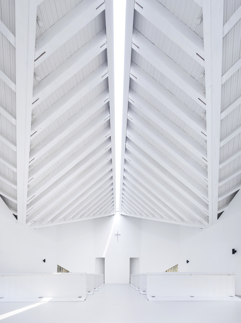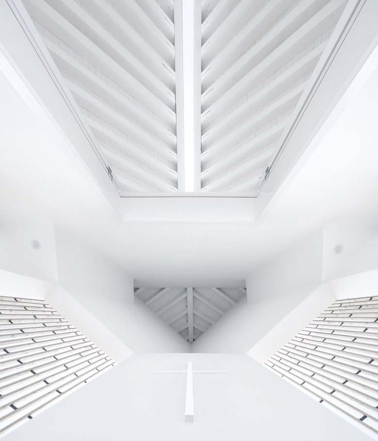 “Light” is an important theme in the religious expressions of church space. In this particular design, light falls through the strip skylight right above the axis of alter into the center of the hall, and also penetrate from behind the holy cross on the alter wall. The presentation of this 300 mm wide light strip is the most powerful defining element of the interior space. Other natural light comes gently through the wood strips into the openings on the wall.