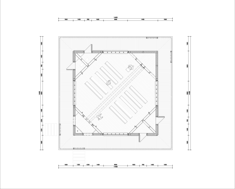 The wooden corridor forms a unique double shell of the central hall space. The inner shell is more closed, leaving natural light to penetrate only through openings on roof and walls. The outer shell, composed of delicate SPF strips, serves as a filter of the view outside, implying the start of a religious spatial experience. The double shell system creates a uniquely interesting oriental architectural space that’s different from the “closeness” of traditional stone chapel, or the “openness” of modern architecture. The small chapel has a perfectly square shaped plan. Even with the 45-degree turning connecting inner space to exterior structure, the square remains highly integrated, symmetrical and center oriented. Hidden diagonal axis in the plan also extends to the roof structure, realizing a complete integrity of space, material and power.