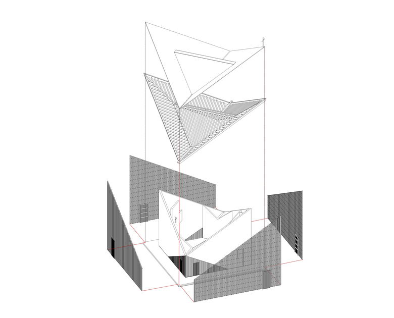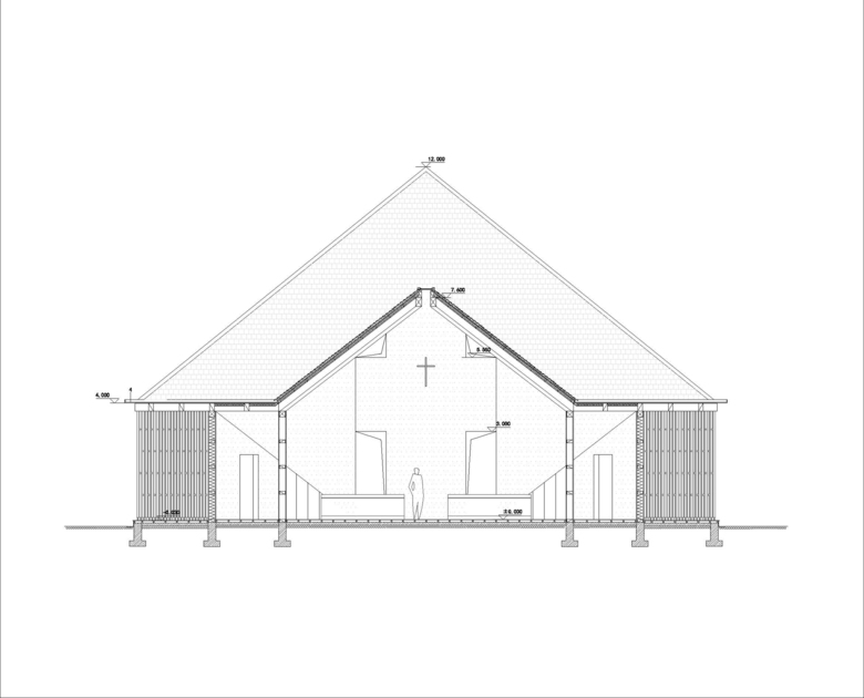 “Light”construction strategy is a wise choice under tight project schedule and limited budget. Roof structure, in accordance with the “cheap” material- natural light, adds expressiveness to the entire space. All interior surfaces are painted white, emphasizing the leading role of light and space. The exterior wood strips and asphalt shingles are left in their natural color, emphasizing the importance of nature. The SPF strips surrounding the church are so delicate that their length-to-radius ratio could be 1:120, largely exceeding the normal load bearing. With length as long as 12 meters and section area only 38*89 mm, the strips are connected to the roof and ground by metal parts at both ends, keeping them in their ideal stretching status. Adjacent wood strips are also connected with U-shape metal parts to insure stability. These together achieved a metal-wood structure that’s extremely simple in material selection and installation.