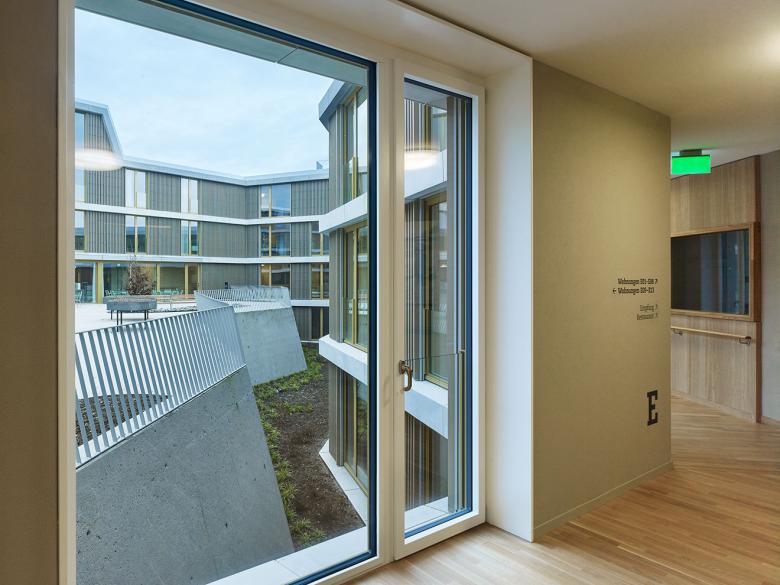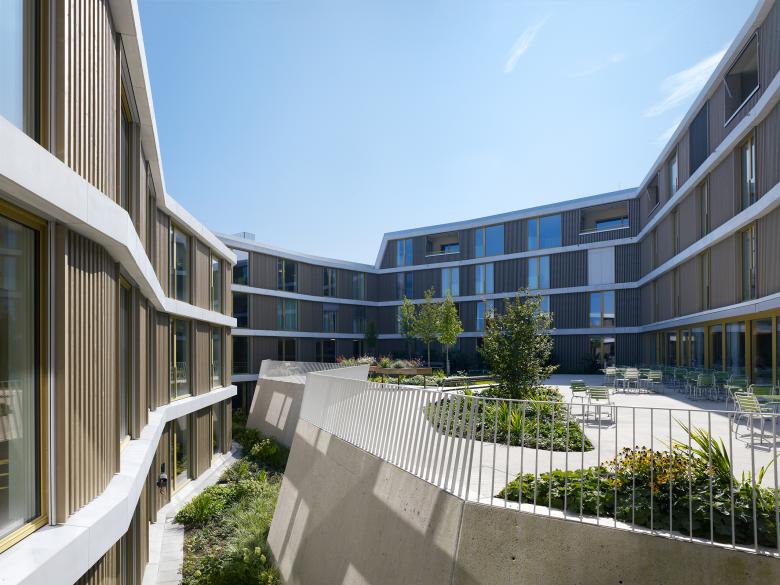 Die beiden Nutzungen von Wohnen und Pflege erhalten je eigenständige Bereiche und profitieren von den Qualitäten des Standorts: gute Anbindung an das Siedlungsgefüge, Parkanlage im Süden und privilegierter Landschaftsbezug in Richtung Norden.