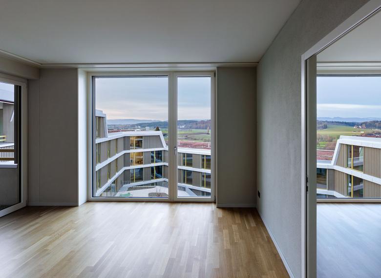 Die aus dem Kontext entwickelte, unregelmässige Volumetrie als fünfeckiger Solitär führt zu einem kompakten Gebäude das den Siedlungsrand mit einer angemessenen Körnung definiert. Die Gebäudegeometrie schafft vielfältige Bezüge zum Aussenraum und bietet mit dem Innenhof ein multifunktionales Zentrum. Die 62 Pflegezimmer und die 36 Alterswohnungen sind durch unterschiedliche Zugänge funktional getrennt. In der Pflegeabteilung blicken die Zimmer entweder nach aussen oder in den Innenhof. Die Wohnungen öffnen sich gegen die Landschaft. Gemeinschaftsräume und ein Esssaal mit Restaurant ergänzen das Raumprogramm.