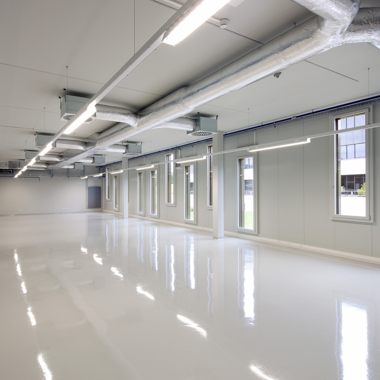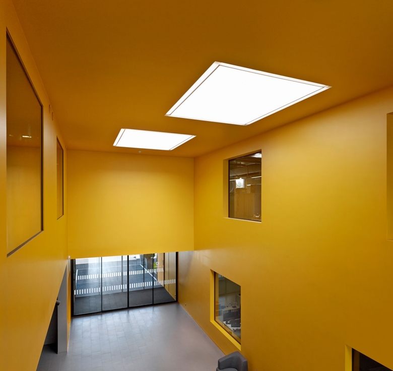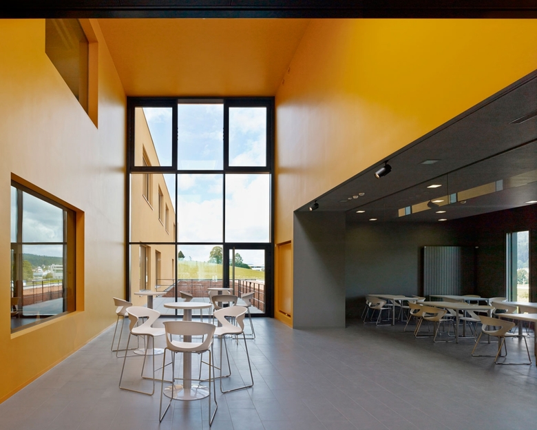 Das Gebäude ist als einheitliches, in das Gelände integriertes Volumen konzipiert. Es steht im Dialog mit den Nachbargebäuden und reagiert auf das Gefälle mit präzise gesetzten Eingangssituationen. Die Produktion an einem Ort zusammenzufassen, war eine wichtige strategische Entscheidung in der Unternehmensgeschichte. Die innere Organisation des Gebäudes ist eine logische Fortführung dieser Entscheidung, indem die verschiedenen Funktionen, also Produktion, Empfang und Administration um einen zentralen Raum organisiert sind. Dieser zentrale, zweigeschossige Raum strukturiert den Parcours im Gebäude und ist ein wichtiger Orientierungs- und Bezugspunkt. Er lässt natürliches Licht in das Gebäude einfallen und dient zugleich als Empfangsraum, Showroom und der Begegnungsort von Mitarbeitern und Besuchern.