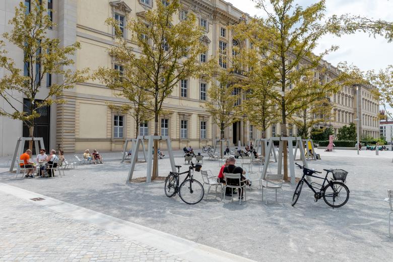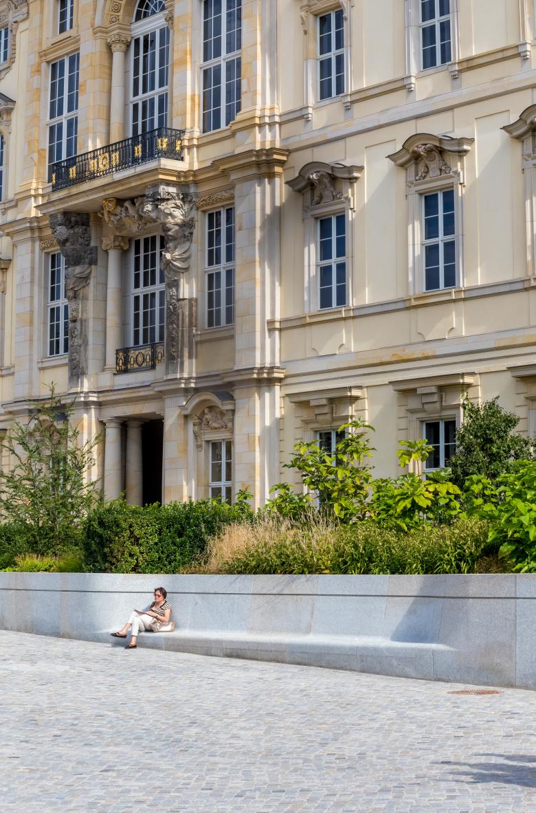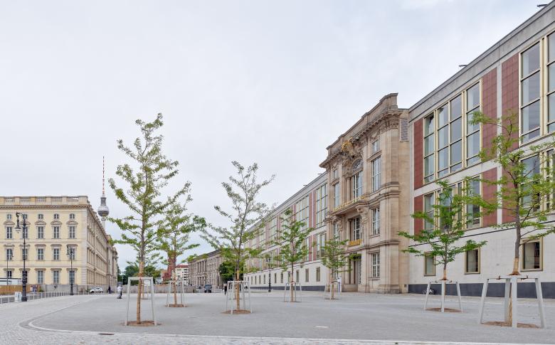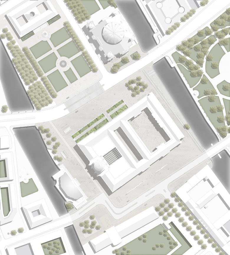 Der Wiederaufbau des Stadtschlosses schließt eine zentrale Leerstelle der historischen Berliner Innenstadt. Mit dem Gebäudesolitär, das als Humboldt Forum Raum für Kunst, Wissenschaft und Kommunikation schaffen soll, ändert sich das räumliche Gefüge in diesem Bereich der Stadt grundlegend. An Stelle des heutigen großräumigen Schlossplatzes mit seinen unklaren Raumgrenzen entstehen an den Fassaden des Humboldt Forums vier deutlich gefasste Teilplätze mit unterschiedlichen Ausrichtungen und stadträumlichen Bezügen.