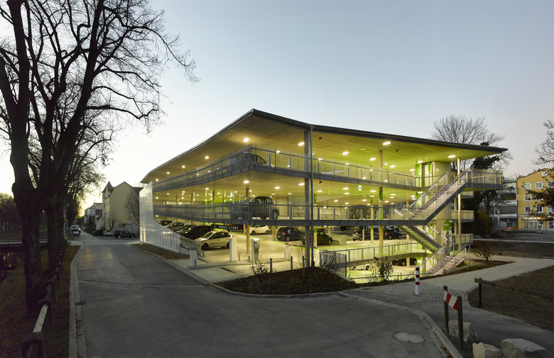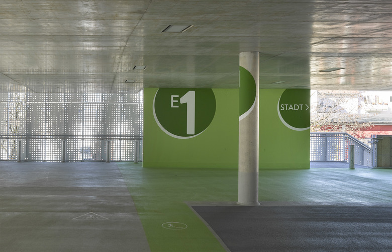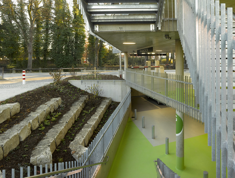 The facade design is maintained consistently throughout and responds to three different urban situations. A solid parapet outlines the ascending ramp, while a lower parapet opens the building towards the park and allows views out. A façade of perforated metal sheet contains the building and defines the city edge towards the streets in the south and west while yet remaining permeable. Greenery growing on steel-cable trellises around the corner cloaks the building towards the north-west, protecting against views, and is complemented by a closed parapet which keeps out the noise. The use of parapets instead of walls in conjunction with brightly colored floors and ceilings and a light well between the two parts of the building ensure that it gets a sufficient amount of sunlight.
