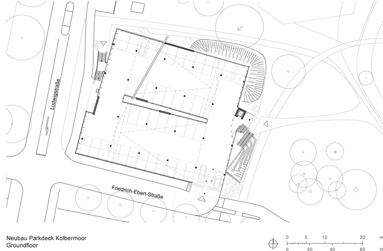 A new public car park offering around 167 parking spaces at the city center was built at the city hall area in Kolbermoor. The site at the Ludwigstrasse/Friedrich-Ebert-Strasse intersection marks the gateway into the inner city and forms the city’s edge towards the south-west where the plot borders the Ludwigstrasse. Simultaneously it opens out towards the city park in the east, establishing a dialogue with the city hall and towards the yet to be built residential and commercial building at the Rosenheimer Strasse in the north. It links into the organically winding web of paths through the park connecting the adjoining areas.