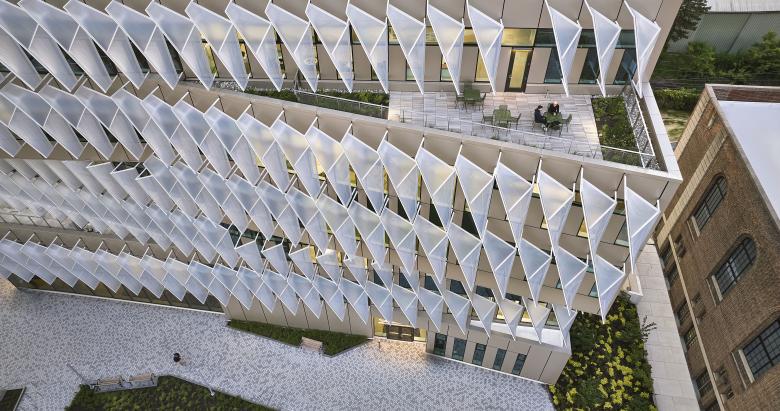 The VLEST is designed to serve as a gateway to the campus, bridging the height difference between Walnut and 32nd Streets. It introduces a plaza deck, creating a pedestrian link between Walnut Street and the Palestra, the university's historic basketball arena, while also connecting with Shoemaker Green. The building includes high-performance labs, office spaces, and collaboration areas, with double-height spaces fostering interaction. The labs are strategically placed along the eastern facade, offering views of the Schuylkill River. The building incorporates a range of passive design strategies, such as operable windows for natural ventilation and a high-efficiency heat recovery system to reduce energy use.