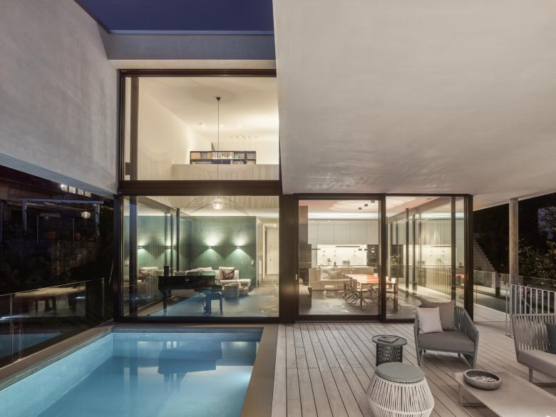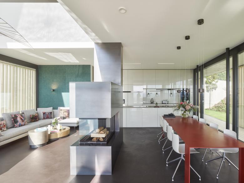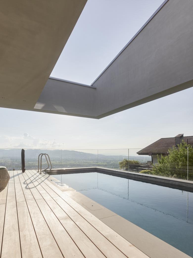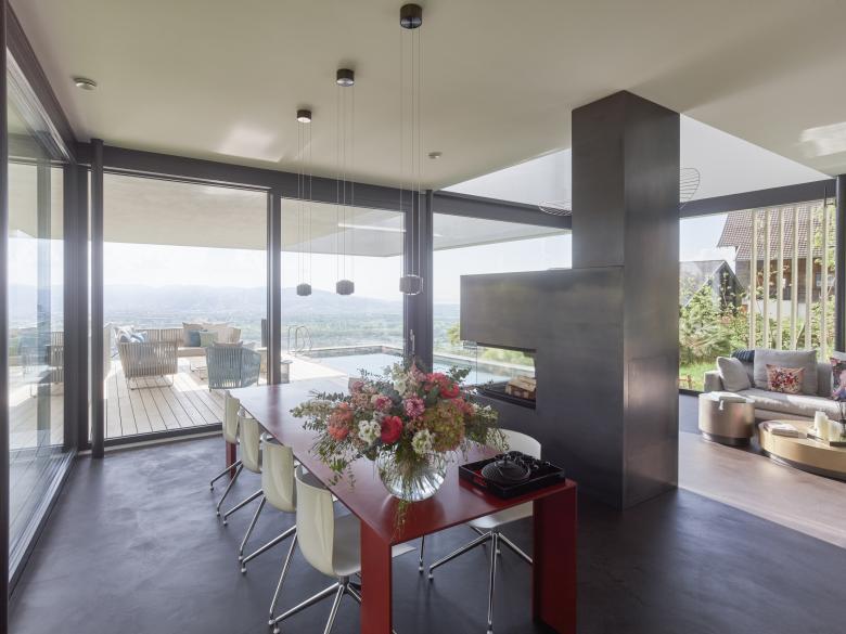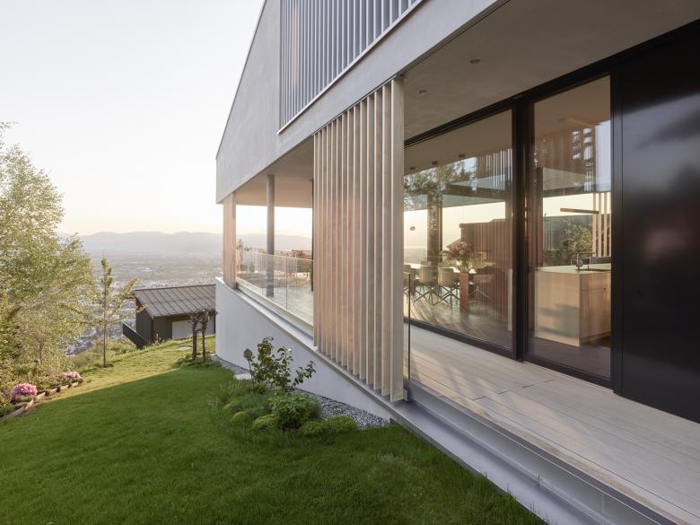 Bergseitig fügt es sich in die Abfolge der raumbildenden Gebäudekanten des Straßenzuges. Der aufragende Hang bildet dabei einen schützenden Rücken für den klar zugeschnittenen Baukörper. Talseitig öffnet sich das Haus und fängt die Qualitäten des Ortes unmittelbar ein. Im fließenden Übergang von Innen- und Außenraum sind Wohnraum, Rückzugsort und Gartenebene räumlich vernetzt und sorgen für ein vielschichtiges Wohnerlebnis.
