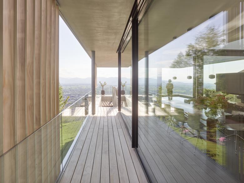 Ein herausforderndes, schmal geschnittenes und stark abfallendes Hanggrundstück mit fantastischem Blick über das Rheintal: das Haus am Moos ergänzt die Siedlungsstruktur eines Weilers oberhalb der Stadt Dornbirn.