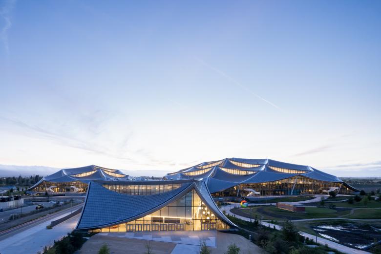Located on a 42-acre site at the NASA Ames Research Center in Silicon Valley, the Google Bay View Campus, consisting of three buildings, totals 1.1 million sq ft – including 20 acres of open space, two workspace buildings, a 1,000-person event center, and 240 short-term employee accommodation units. All three buildings are constructed as lightweight canopy structures optimized for interior daylight, views, collaboration, experiences and activities.