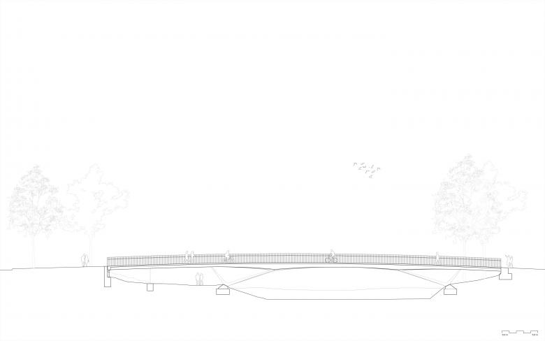 Geländerelemente, deren Erscheinung auf ein Minimum reduziert ist, übertragen das Konzept des eleganten Schwungs spürbar auch beim Überschreiten der Brücke. Die Stützen sind als schlanke Bauteile aus aufgelösten Stahlblechen konzipiert und stellen zusammen mit dem gefächerten Träger eine formale Einheit dar, die ihrer Rolle als den Landschaftraum prägendes Element gerecht wird.