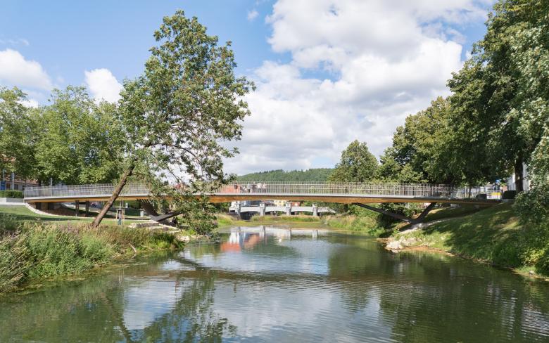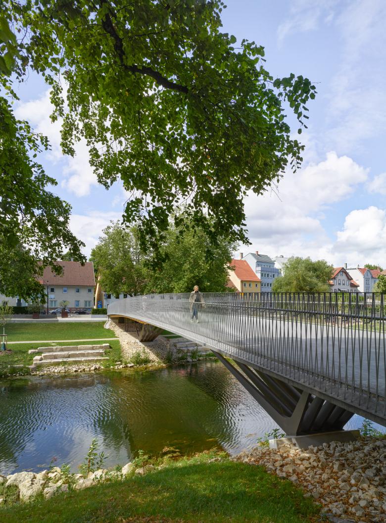 Die neue Rathausbrücke nimmt in ihrer Gestalt als Deckbrücke den Verlauf der Rathausgasse auf und verlängert diese bis an das andere Flussufer. Dort knüpft sie an den Donauradweg an und verbindet diesen mit der Tuttlinger Innenstadt. Mit der geforderten Breite von sechs Metern wird eine großzügige und begreifbare Verbindung geschaffen. Es wurde auf eine aufstrebende Konstruktion verzichtet. So bleibt der Blick frei auf die umgebenden stadträumlichen Bezüge und die wunderschöne Fluss- und Uferlandschaft, die Tuttlingens Innenstadt durchzieht und ihren unverwechselbaren Charakter ausmacht. Die Aufenthaltsqualität im Bereich des Donauparkes unter der Brücke wird durch eine feinfühlig gestaltete Untersicht aufgewertet. Darüber hinaus beschränkt sich der Entwurf zurückhaltend auf funktionale Qualitäten, eine innovative semiintegrale Tragwerkslösung, materialgerechte Detailgestaltung und robuste wartungsarme konstruktive Durchbildung.