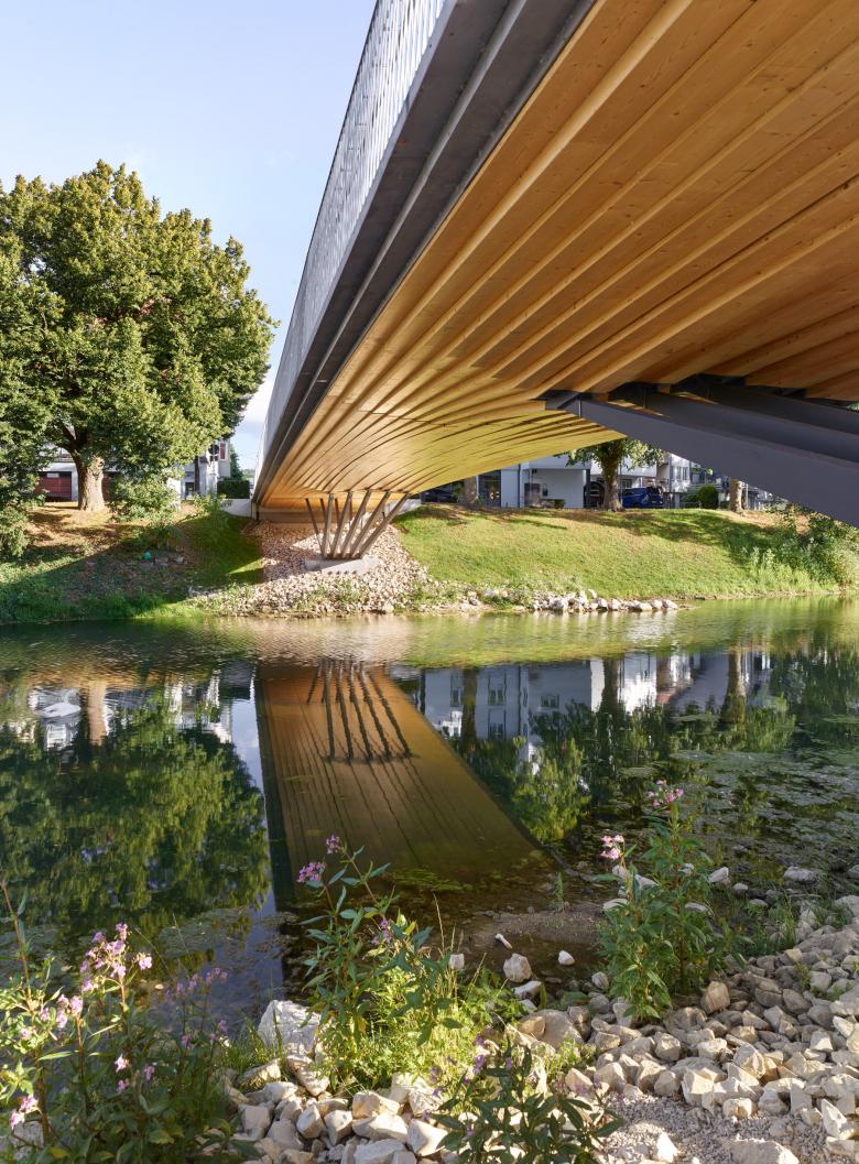 Im witterungsgeschützten Raum oberhalb des Hochwasserstands HQextrem entfaltet sich der Träger als blockverleimter Brettschichtholzkörper. Zur konzentrierten Ableitung hoher Kräfte mit sehr schlanken Bauteilen werden die Unterbauten aus Stahl ausgeführt. Auch im Hochwasserfall steht damit eine robuste Lösung zur Verfügung.