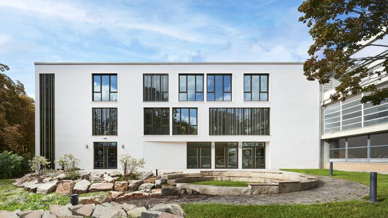 Der Neubau bietet eine zusätzliche Nutzfläche von über 1500 Quadratmetern und ergänzt den Bestand wie selbstverständlich: Dort, wo einst die Stadtmauer Frankenthals entlangführte, präsentiert sich nach außen hin ruhig und nüchtern das Bestandsgebäude als Stahlbetonskelettbau mit Sichtbetonfassade. Die Erweiterung wiederum prägt nun ein Massivbau mit Putzfassade, die farblich den Duktus des Bestands aufnimmt. Das Gebäude orientiert sich an der westlichen Kante des Bestands und schließt an der südlichen Fassade als dreigeschossiger, winkelförmiger Anbau an. Großzügige Fensterbänder gliedern die Fassade und verleihen ihr eine gewisse Leichtigkeit. Ein Wechselspiel aus schmalen und breiten, einseitig schräg anlaufenden Gewänden mit glatter und strukturierter Putzoberfläche gibt ihr Tiefe und Rhythmus. Kletterpflanzen an der Fassade im Süd-Osten nehmen Bezug auf die Gartengestaltung und die umgebende Kastanienallee und tragen zur Verbesserung des Klimas bei.