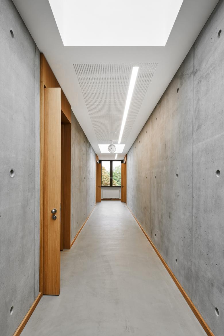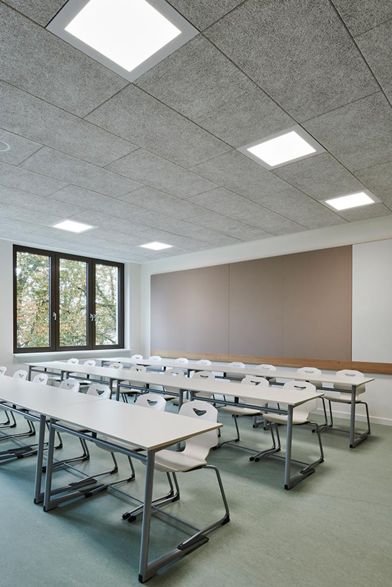 Durch Materialien wie Sichtbeton und Eichenholz verbindet sich der Neubau im Innern mit dem Bestand; eine moderne, zeitgemäße Interpretation verleiht ihm eigene Charakterzüge. Prägen Sichtbetonwände und Estrich die Flure und Treppenhäuser, finden sich in den Klassenräumen Linoleum-Böden. Entlang der Flure ziehen sich Einbauschränke aus Eichenholz, das auch von den Türen und Portalen aufgenommen wird und einen Kontrast bildet zum Sichtbeton. Das zurückhaltende Farb- und Materialkonzept wird in den Klassenzimmern erweitert um grüngraue Farbakzente, die sich in den Einbauschränken und Garderoben wiederfinden, während die lose Möblierung in neutralem Weiß und die Wände in hellen Tönen gehalten sind.