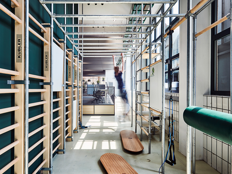 Auf einer Fläche von 1.473 Quadratmetern ist ein innovatives Arbeitsumfeld entstanden, das sich in unterschiedliche Zonen gliedert und die Schaffung positiver Arbeitsräume zum Ziel hat – mit dem Menschen im Mittelpunkt. Das architektonische Konzept sieht ein Wechselspiel aus Kommunikation, Austausch und Privatsphäre vor. Der Mix aus Kreativ- und Ideenfeldern, Energiebereich, Sportfeld, Essbereich, Ruhezone sowie abgetrennten und privaten Arbeitsplätzen ermöglicht den Mitarbeitern eine freie, individuelle Gestaltung des Arbeitsumfelds – ganz nach Bedarf. Getreu dem Motto der Gesundheitskasse »gesundnah« soll durch verschiedene gestalterische Elemente die Verbundenheit zur Natur in der Arbeitsumgebung gestärkt und so das Wohlbefinden der Belegschaft gefördert werden. Die großflächig verglaste Fassade lässt zudem lichte Arbeitsflächen entstehen und sorgt für eine intakte zirkadiane Rhythmik, die neben dem Wohlbefinden auch die Produktivität steigert.