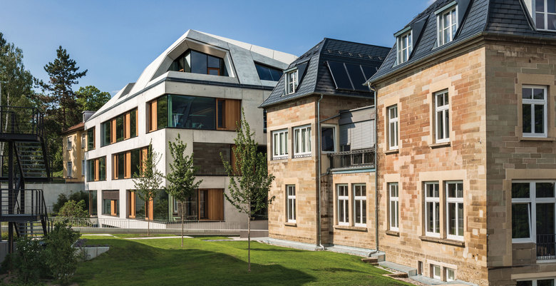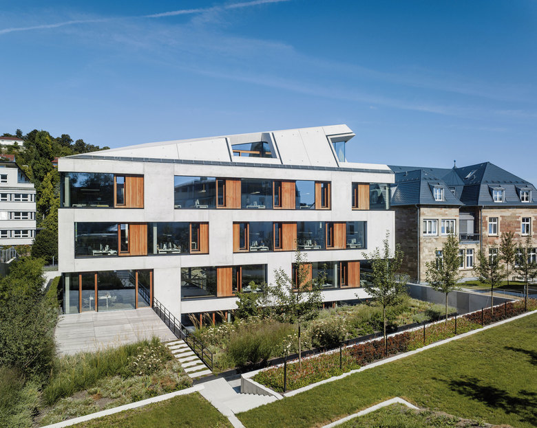 Die Anforderungen an ein zeitgemäßes Bürogebäude sind mannigfaltig. Das gilt umso mehr, wenn unterschiedliche Disziplinen sich unter einem Dach wohlfühlen sollen wie in diesem Fall: Neben dem Büro für Architektur und Innenarchitektur gehören eine Gesellschaft für die Entwicklung von Monomarken-Konzepten sowie eine Agentur für Kommunikation, Corporate Design und Visual Merchandising zur Unternehmensgruppe. Die städtebaulich heterogene Situation im Herdweg nutzten die Architekten, um einen Solitär zu setzen. Schlicht, jedoch markant. Ein Blickfang, der Passanten und Autofahrer gleichermaßen in seinen Bann zu ziehen vermag. Dem robusten Charme des Sichtbetons - als zweischalige Betonfassade mit Kerndämmung ausgeführt - schmeichelt die ätherische Transparenz großzügiger Fensterbänder. Holzelemente aus Sipo Mahagoni gliedern übergeordnet und geben der Fassade Tiefe. Die klaren Linien bringen sowohl Ordnung als auch Dynamik in die Fassade. Charakteristisch für die Stahlbetonbauweise ist die Dachkonstruktion, ein räumliches Faltdach, das das klassische Satteldach neu interpretiert.