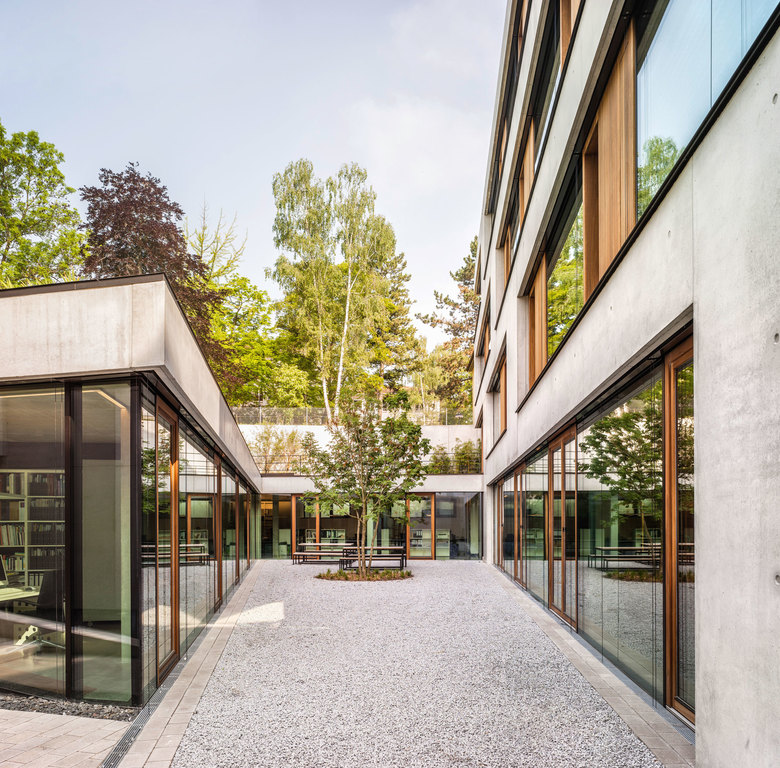 An das großzügige Casino im Gartengeschoss dockt ein möblierter Innenhof an. Auf der einen Seite wird er von dem eingeschossigen Gebäudeflügel flankiert. Auf der anderen Seite öffnet sich ein zweigeschossiges Atrium, das nur eine verschiebbare Glaswand vom Casino trennt. Überhaupt das Atrium: Vom Erdgeschoss aus überfliegt das Auge den beeindruckenden Luftraum, in dem eine vom Mikadospiel inspirierte Licht-Installation hängt. Auch von der offen gestalteten Stahltreppe, die vom Gartengeschoss bis unters Dach reicht, ergeben sich vielfältige Blickbezüge.