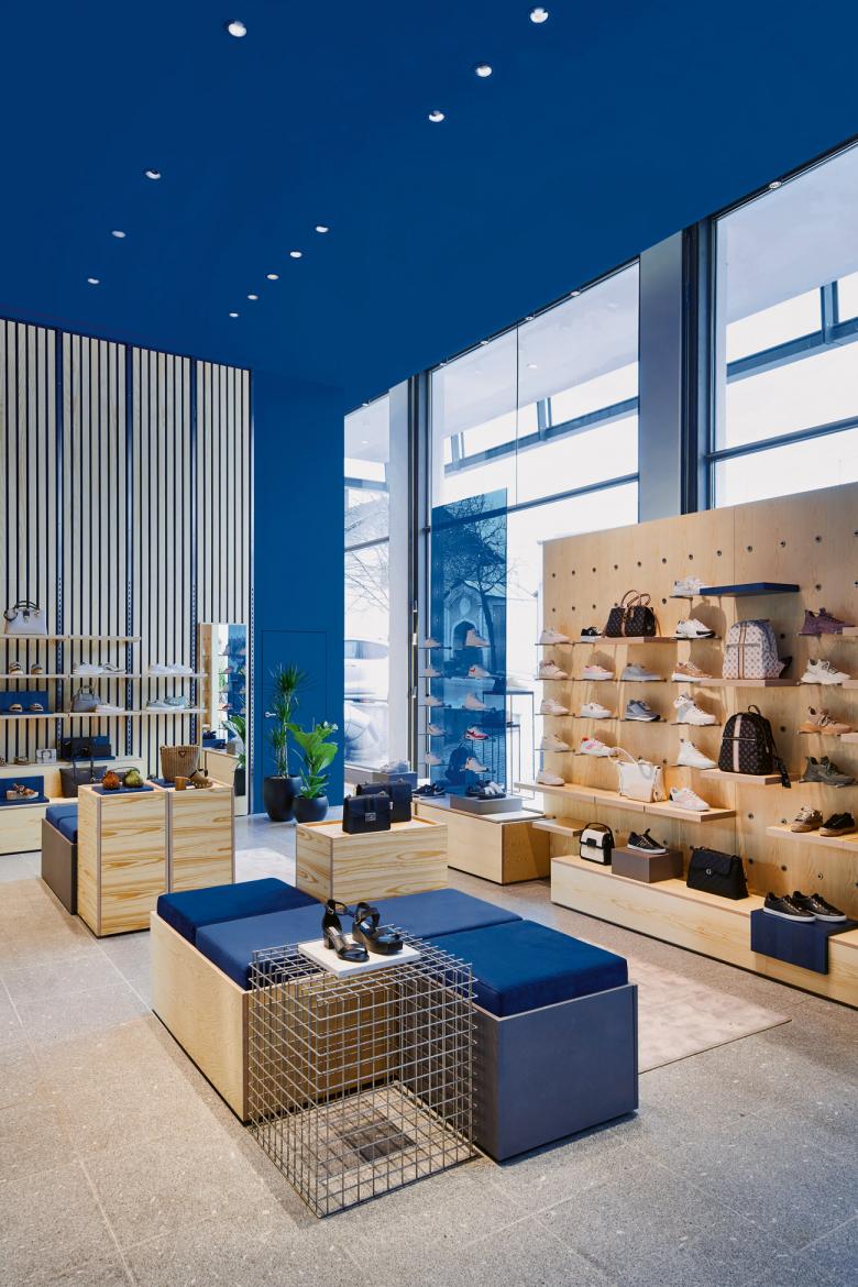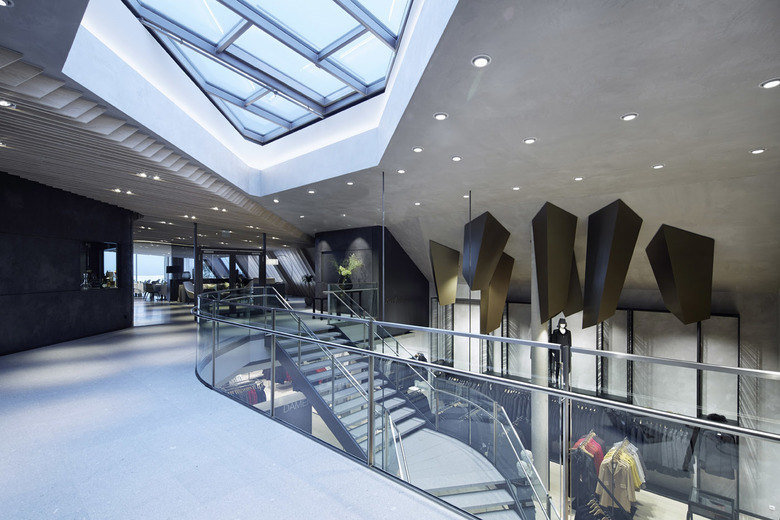 Die Architekten und Innenarchitekten von blocher partners haben die Hanglage der Garhammer-Immobilie in bester Split-Level-Manier spielerisch in den Verkaufsprozess einbezogen. Natürlich gibt es Treppenhäuser und Aufzüge, der Reiz aber liegt in der Abkehr von der klassischen Stockwerksbauweise. Die Treppe als zentrales Verbindungselement verknüpft sämtliche Ebenen, wobei sie stilistisch variiert: mal einfacher Steg, mal mehrfach geknickte oder sanft geschwungene Treppe, mal Mini-Passerelle oder auch Skyway für den bequemen Übergang von Alt zu Neu. Das Ausmaß der „Luftraumüberbrückung" zeigt sich besonders eindrucksvoll im Neubau. Dort strebt ein an M.C. Escher erinnerndes Konstrukt aus Säulen, gewendelten Treppenläufen und Podesten vom Einrichtungsgeschäft „Freiraum" über die Taschen-, Kinder- und Damenabteilung dem Oberlicht im zweiten Obergeschoss entgegen.