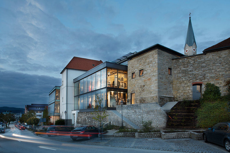 Für die Fassade des Neubaus standen die Architekten in intensivem Austausch mit Behördenvertretern, um für die Erweiterung die ortstypische Formsprache zu wahren, vor allem die charakteristische Giebelstruktur am Marktplatz. Südwestlich des Areals galt es, die dort verlaufende, erhaltenswürdige Stadtmauer beim Umbau des Gründingerhauses harmonisch in den Komplex zu integrieren. Alt und Neu stehen nun versöhnlich nebeneinander. Giebel und Gebäudekanten des Neubaus am Marktplatz interpretieren die dörfliche Geschichte erfrischend modern; die Gliederung der Fassade mit ihren verschieden großen Fensterelementen orientiert sich am abfallenden Gelände und nimmt die Typologie der Nachbarbebauung auf. Und der entkernte und mit einem zurückhaltenden Zeltdach versehene Gründinger-Turm erweist sich als ein mehr als würdiger Nachfolger, der zusammen mit dem neu errichteten Glaskubus die Adressbildung Garhammers entlang der Ringermauerstraße deutlich schärft.