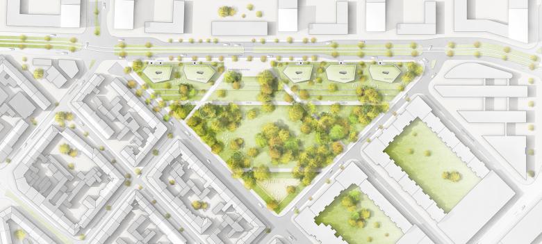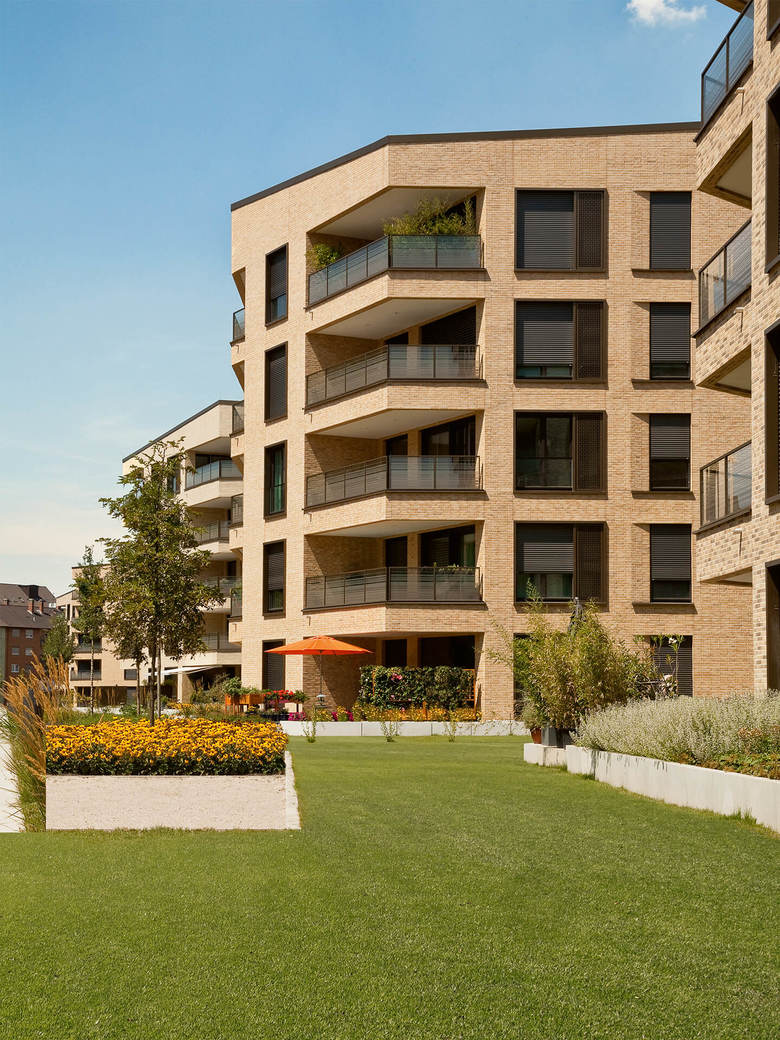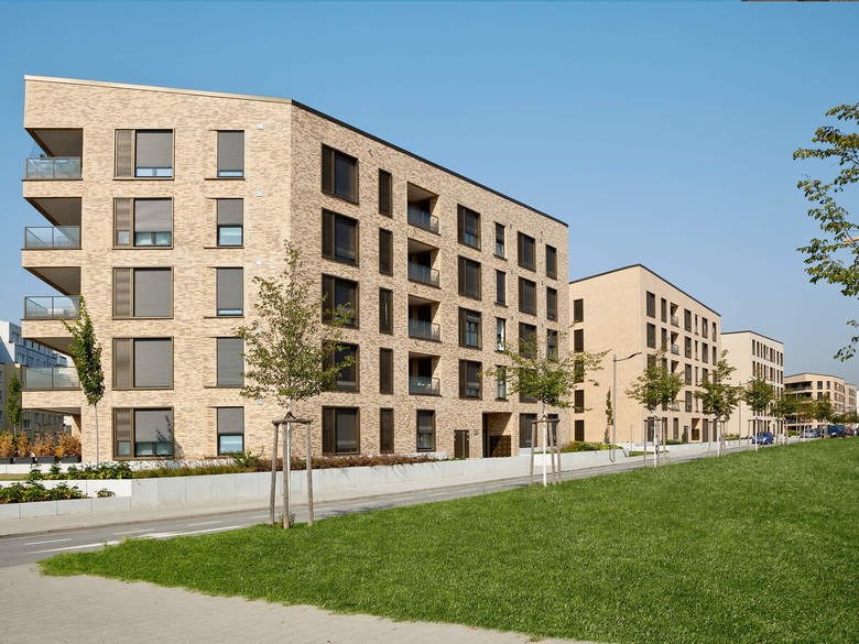 Der Gewinnerentwurf des architektonischen Wettbewerbs, ausgelobt von der Stadt Mannheim, sieht fünfgeschossige Stadthäuser mit insgesamt 100 Wohnungen vor. Wegen der exponierten Lage direkt an der öffentlichen Grünfläche war es besonders wichtig, eine sehr hochwertige und architektonisch anspruchsvolle Bebauung zu entwickeln. Das Konzept von blocher partners zeichnet sich durch seine weiche Kante zum Park hin aus. Die fünf Gebäude sind unregelmäßig polygonal angelegt - und lassen doch eine gemeinsame Architektursprache erkennen. Zugleich gewährleistet ihre Anordnung, dass ein breiter öffentlicher Übergang zwischen dem Hanns-Glückstein-Park und dem denkmalgeschützten Lokschuppen-Ensemble frei bleibt.