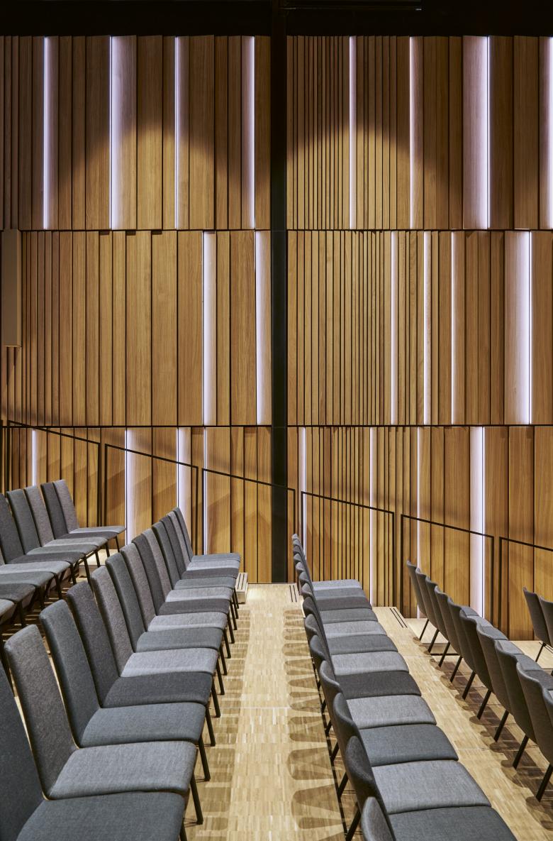 Schon auf der Eingangsebene entfaltet der Theatersaal die neue räumliche Freiheit: ein abgesetzter Boden zeichnet dort seine Silhouette nach. Verstärkt wird dieser Effekt wiederum durch den Einsatz von Lamellen: aus heimischer Eiche gefertigt bekleiden sie die Wände und verbinden visuell Innen und Außen sowie die Ebenen innerhalb der Halle. Die Lamellen ziehen sich vom Eingang bis zum Bühnenturm hinauf, wo das harmonische Zusammenspiel von Architekten und Innenarchitekten in gewisser Weise seinen Höhepunkt erfährt: Das helle, warme Eichenholz kleidet die Wände des Theatersaals und bildet einen schönen Kontrast zur ebenfalls neugestalteten und gänzlich in Schwarz gehaltenen Theaterbühne und Saaldecke.
