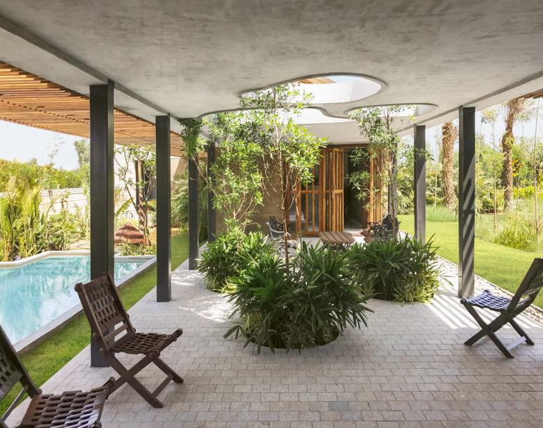 Im indischen Bundesstaat Gujarat entsteht eine Ferienhausanlage mit 650 Bungalows, einem Clubhaus, Restaurant, Pool, Spa-Bereich, Bistro und ausgedehnten Sportanlagen. Unter Berücksichtigung nachhaltiger Kriterien und mit dem Einsatz recycelter Materialien wird in der trocken-heißen Region ein Areal entwickelt, das Assoziationen an eine Oase weckt: Von Dattelpalmen gesäumte Straßen und üppige Grünflächen strukturieren das Gelände. Die Bungalows werden um großzügige, verschattete Außenräume ergänzt und bieten ihren Bewohnern ein hohes Maß an Lebensqualität. Die Bauweise basiert auf traditionellen, indischen Bautechniken – aufgewertet durch moderne technologische Erkenntnisse.
