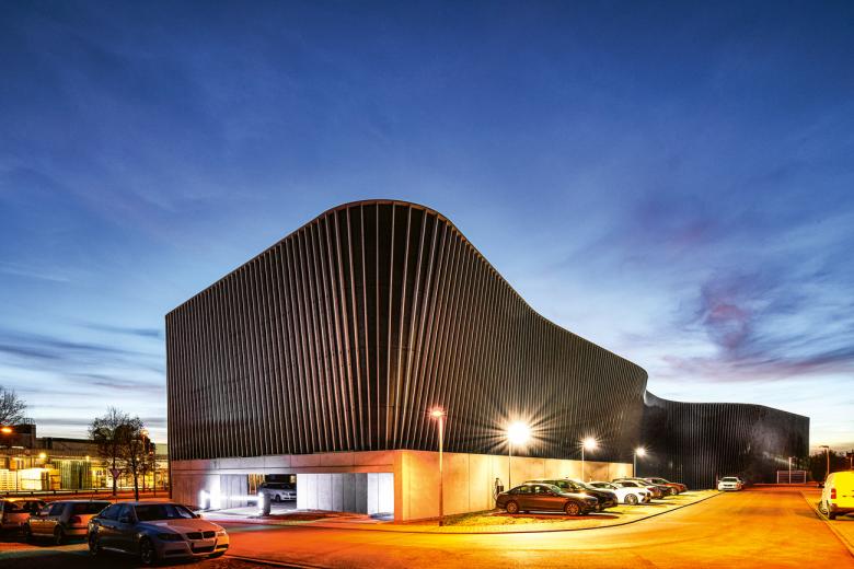 Der mit dem ersten Platz ausgezeichnete Wettbewerbsentwurf für den Neubau eines Parkhauses vermittelt durch seine geschwungene äußere Form zwischen Mercedes-Benz-Werk und angrenzenden Wohngebäuden. Metalllamellen geben der Fassade ihre organische Struktur. Sie erzeugt ein fließendes Konstrukt das sich nach oben hin öffnend den Schallschutz unterstützt und Einlässe für Belichtung und Belüftung schafft. Durch seitliche Perforation können die Lamellen als Unterkonstruktion für Fassadenbepflanzung genutzt werden, wo durch ein günstiges Mikroklima entsteht.