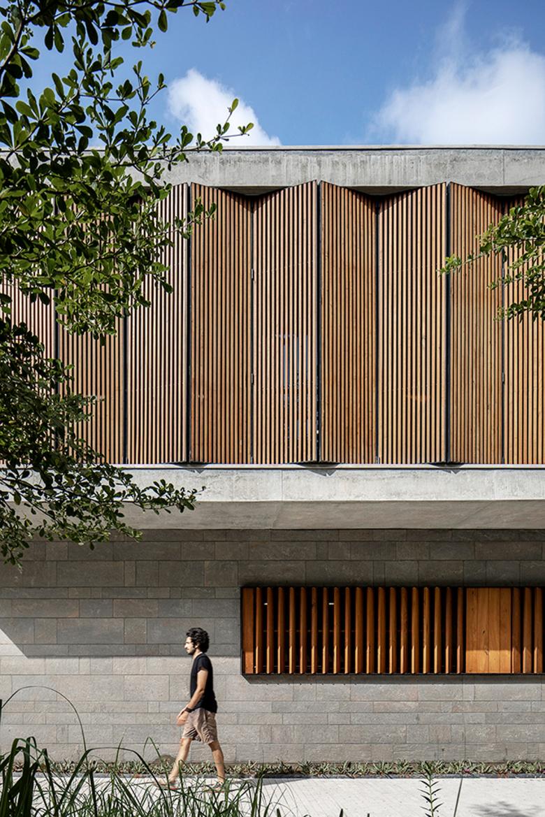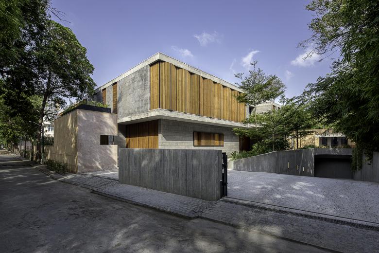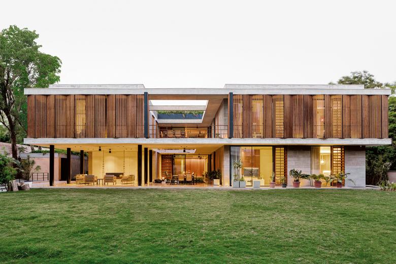 Zusammenleben mit so viel Privatsphäre wie möglich, so lautete das Thema bei der Planung der Residenz für eine indische Großfamilie in Ahmedabad. Um trotz hoher Nachbarbebauung einen intimen Garten zu schaffen, umfassen die Gebäude einen Innenhof. Daran schließen sich nahtlos die Wohnräume der Eltern und Großeltern an, deren Fassaden sich großflächig öffnen lassen. Von außen präsentiert sich das Gebäude geradlinig, mit beweglichen, raumhohen Verschattungsmöglichkeiten. Für alle im Haus lebenden Parteien gibt es eigene Eingänge.