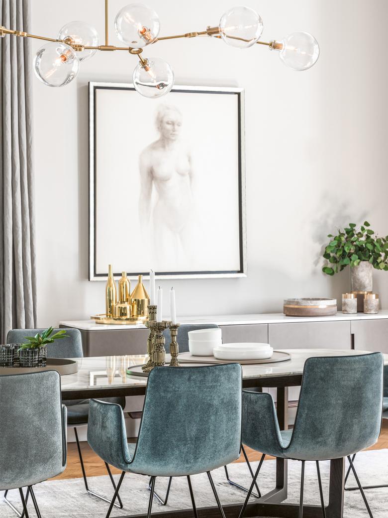 Beeindruckt beim Betreten des Hauses bereits der Dielenbereich mit seinem Gewölbe und einem vorgelagerten Garderobenbereich, weiß die Küche mit freistehender Arbeitsfläche aus Naturstein und einer Möbel- und Accessoire-Wahl in gedeckten Farben zu überzeugen. In dem anschließenden Ess- und Wohnbereich ergänzen bedacht gesetzte, pudrige Farbakzente die elegante Erscheinung von Stuck und Fischgrätparkett. Momente der Ruhe sowie der Zusammenkunft gewähren ein großer Esstisch mit Marmorplatte oder die Sofalandschaft in hellem Grau. Etwas kerniger und männlicher erscheint das daran angrenzende Herrenzimmer mit dunklen Samtvorhängen, einem englischen Chesterfieldsofa und einem Kamin aus Naturstein und Messing.