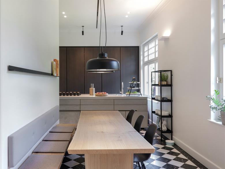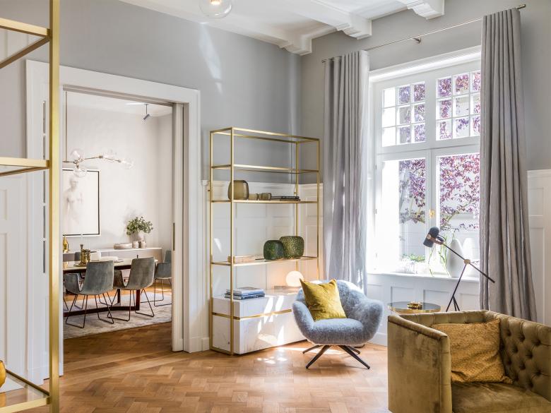 Weitläufig, aber gemütlich, herrschaftlich, aber modern: Bei dem behutsamen und bis ins letzte Detail durchdachten Umbau eines Gründerzeitgebäudes ging es nicht darum, etwas vollkommen anderes zu gestalten. Vielmehr sollten moderne und ursprüngliche Elemente so kombiniert werden, dass auf den weitläufigen 450 Quadratmetern Wohnfläche eine einladende Atmosphäre entsteht. Gelungen ist das durch eine behutsame Restaurierung einzelner Elemente, einer harmonischen Einheit aus Farb- und Materialwahl sowie einer Lichtplanung, die jeden Raum individuell in Szene setzt.