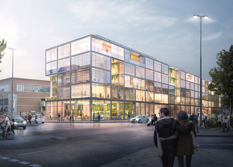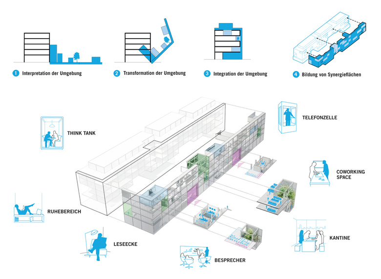 Die Fassade ist sowohl stadträumlich als auch technisch ein dialogisches Bindeglied zwischen den Ansprüchen der Umgebung und den innenräumlichen Komfortanforderungen. Denn das Gebäude exponiert sich zu zwei stark befahrenen Straßen im Süden und Westen. Auf die daraus resultierenden Anforderungen hinsichtlich des Schallschutzes und sommerlichen Wärmeschutzes wird mittels der vorgestellten zweiten Gebäudeschicht reagiert. Wintergärten und Doppelfassaden schaffen bauklimatische Pufferzonen. Terrassen, Treppen und Bepflanzungen bieten Verschattung.