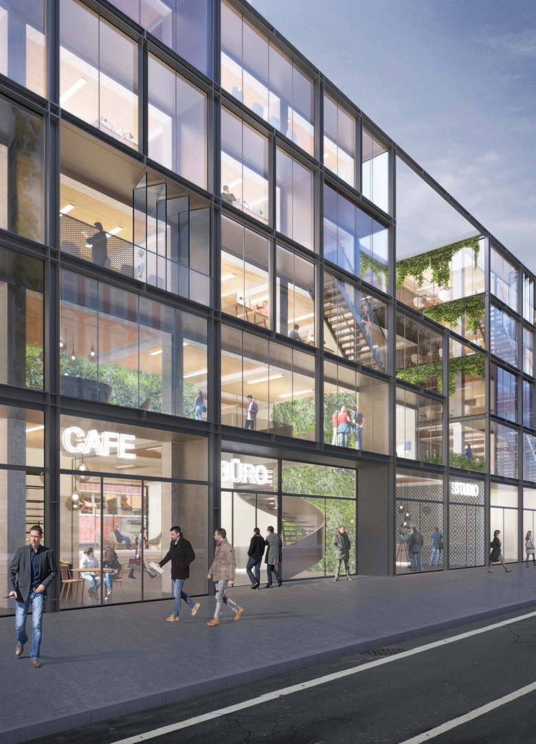 Das Bürohaus „Built with St. Pauli“ bildet als „urbanes Regal“ die umgebende Stadtlandschaft im Gebäude ab. Gemeinschaftlich genutzte Räume, wie Besprechungsräume, Teeküchen, Bibliothek, Showroom, etc. formen ein vertikales St. Pauli en miniature in der Fassade. Dahinter spannt sich die moderne Bürowelt als Dreispänner mit innenliegenden Erschließungskernen organisiert auf. Der 18m breite und 120m lange Riegel fungiert als Vermittler zwischen heterogenen, großmaßstäblichen Architekturen - Rindermarkthalle, Stadion, Bunker - im Osten des Grundstücks und der Kleinteiligen Bebauung im Westen.