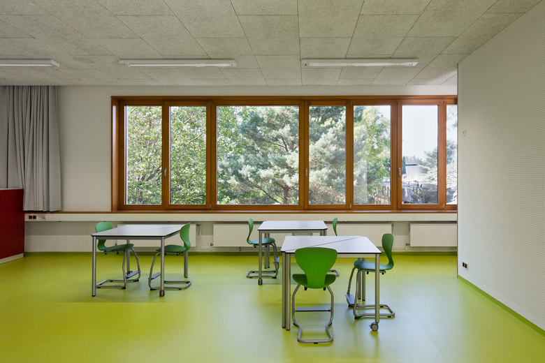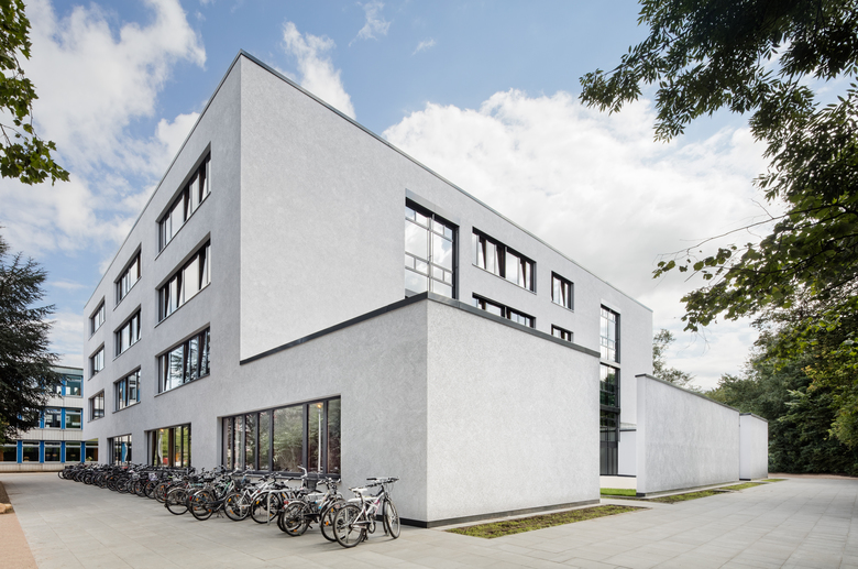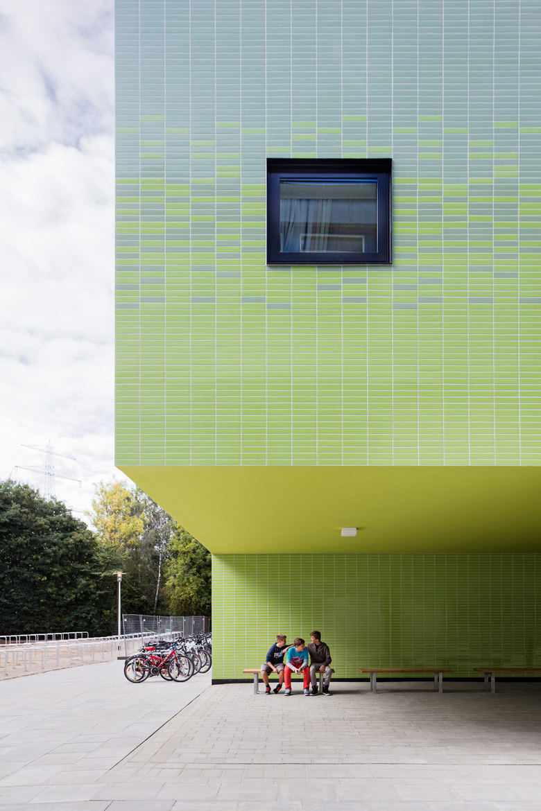 Bei der Fassadengestaltung orientierte man sich an den Bestandsgebäuden auf dem Schulcampus und wählte die keramische Fliese, um den Eingangsbereich zu definieren. Dabei greift sie in ihrer Farbigkeit die umliegende Umgebung auf, sodass die Fliesen in einer Form von Pixellierung vom hellen Himmelblau in das umliegende Grün verlaufen. Das Farbkonzept setzt sich im Inneren des Gebäudes fort und dient als Leitsystem und Orientierungshilfe zur Stärkung der, im pädagogischen Konzept der Schule geförderten, Jahrgangsidentifikation.