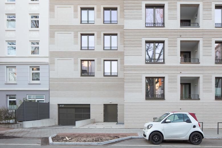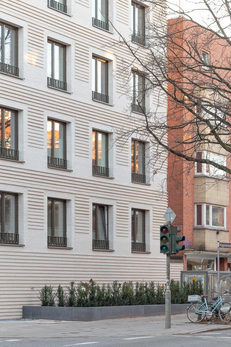 Zum Straßenraum hin erzeugt die Lochfassade mit hellgrauem Klinker, durch die Reduktion auf wenige, sich wiederholende Motive, ein ruhiges und homogenes Erscheinungsbild. Abermals wird zwischen dem neuen Eckgebäude und der Nachbarbebauung vermittelt, indem das Material der Bebauung an der Müggenkampstraße und die Farbe des hellgrauen Putzes der Nachbarbebauung an der Sartoriusstraße zitiert wird. Das Mauerwerk wird in seiner horizontalen Gliederung gestärkt, indem geschossweise aus der glatten Klinkerfläche jede zweite Läuferschicht hervortritt. Um die Wandöffnungen bilden sich dabei als Referenz zur gründerzeitlichen Fassadengestaltung Faschen. Entlang der Brüstungsebenen interpretiert die Längsprofilierung der hervortretenden Läuferschichten klassische Gurtgesimse während sie im Hochparterre einen massiven Sockel bildet.