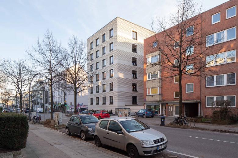 Das homogene Wohnviertel um die Sartoriusstraße weist überwiegend typische Hamburger Rotklinkergebäude auf, als auch gründerzeitliche Bauten. Auf dem Eckgrundstück hinterließ der Abbruch eines Hochbunkers eine Baulücke, die durch den sechsgeschossigen Wohnungsbau mit Anbindung an die Nachbargebäude an der Sartoriusstraße und der Müggenkampstraße geschlossen wird. Der monolithisch wirkende Baukörper gewinnt durch subtraktive Eingriffe an der Gebäudekubatur, vor- und Rücksprünge, an Dynamik und vermittelt so zwischen alt und neu.