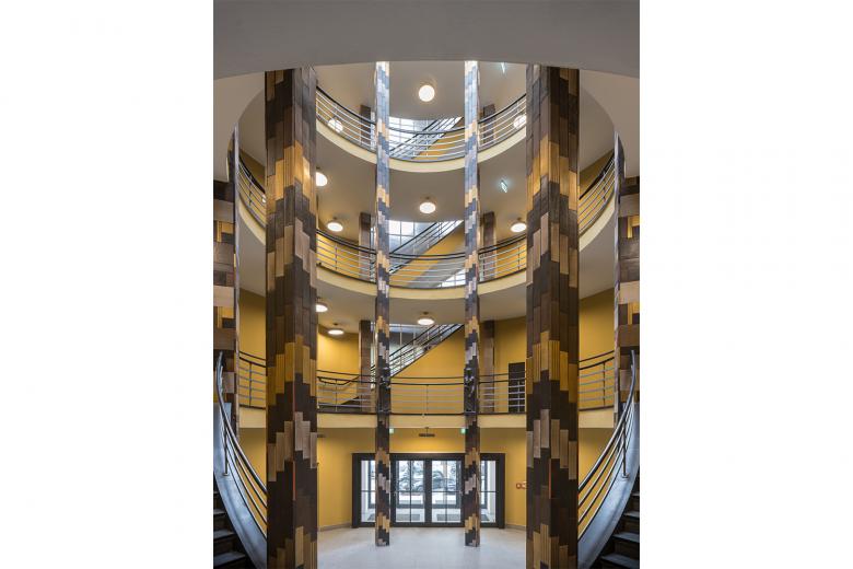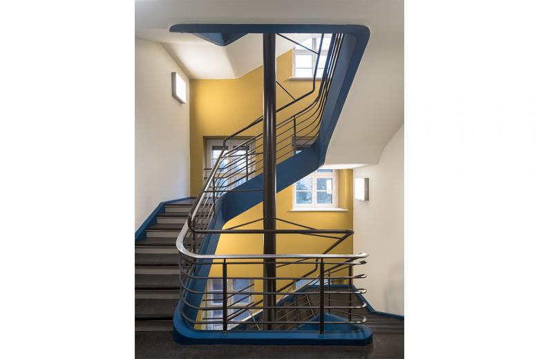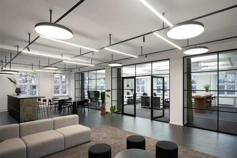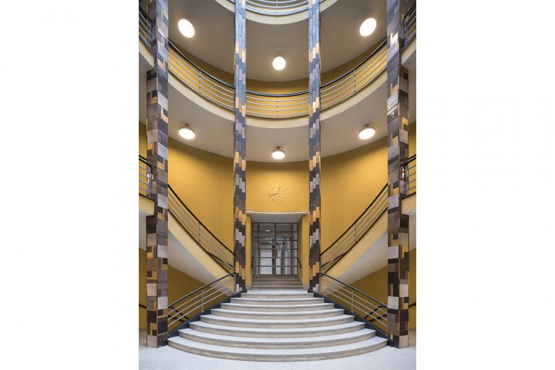 Im Zentrum steht die Frage, wie modern dürfen denkmalgeschützte Umbauten sein, ohne die Geschichte außer Acht zu lassen? So erhält der Entwurf von BFA einerseits die prägnante Außengestaltung und die großzügigen Treppenhäuser dieses relevanten Werks des Berliner Expressionismus. Die ursprünglichen Raumhöhen werden freigelegt, der umliegende Park historisch wiederhergestellt. Anderseits setzt BFA im Inneren die ideale Atmosphäre für zeitgemäßes Arbeiten um: Großräumige Open-Space-Flächen werden mit gläsernen Büros kombiniert, die markanten Eckzimmer sind die neuen Konferenzräume. Die ursprüngliche industrielle Bauweise fügt sich so mit neuzeitlichen Materialien und Einbauten zu einem neuen Ganzen.