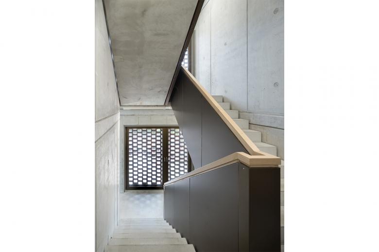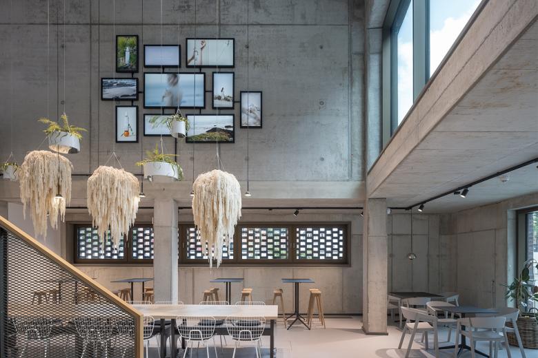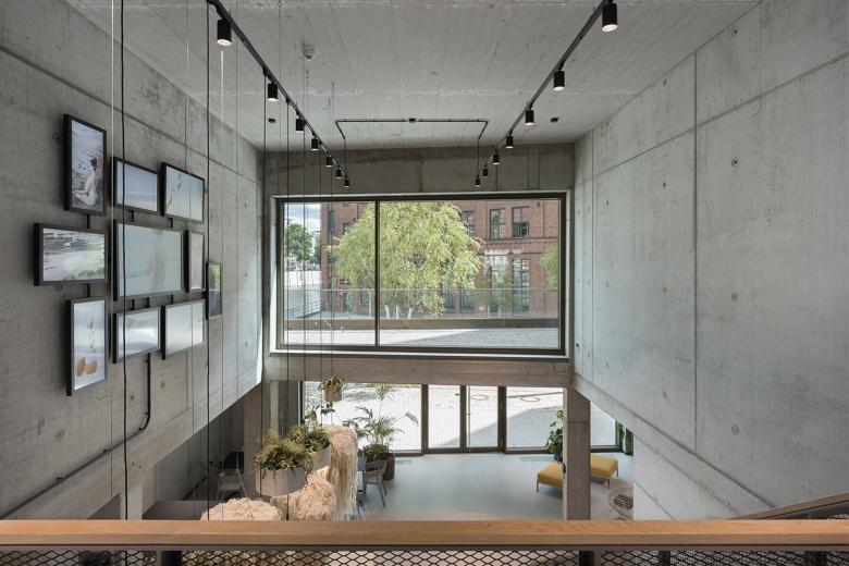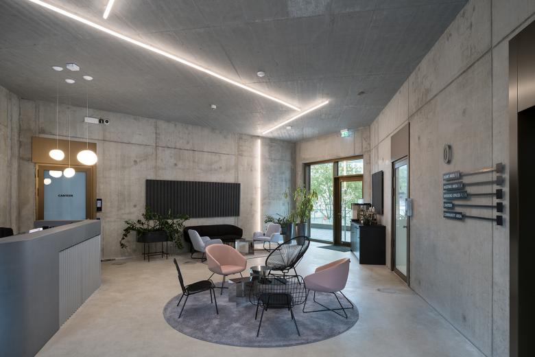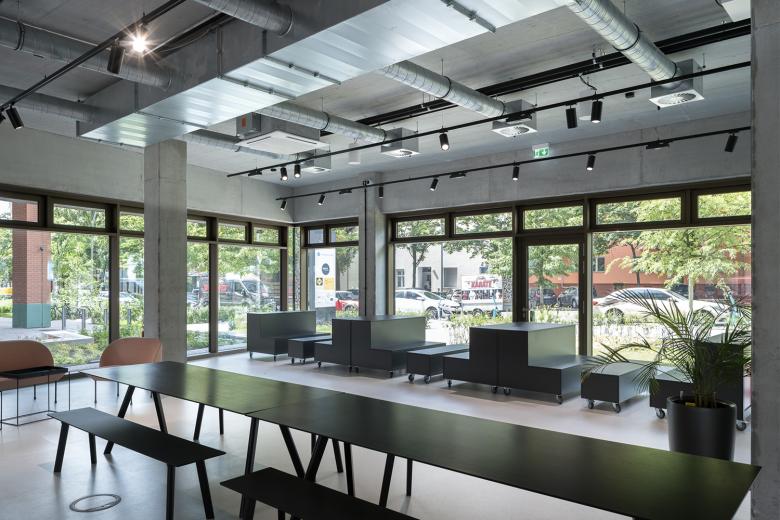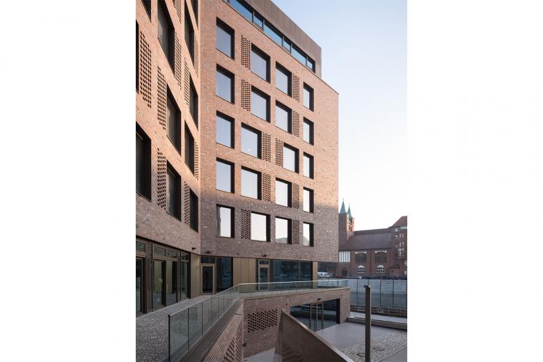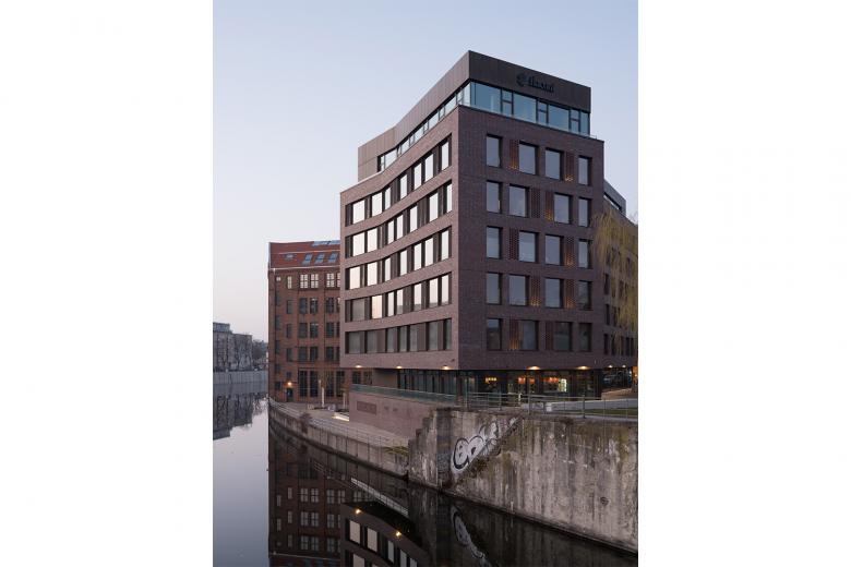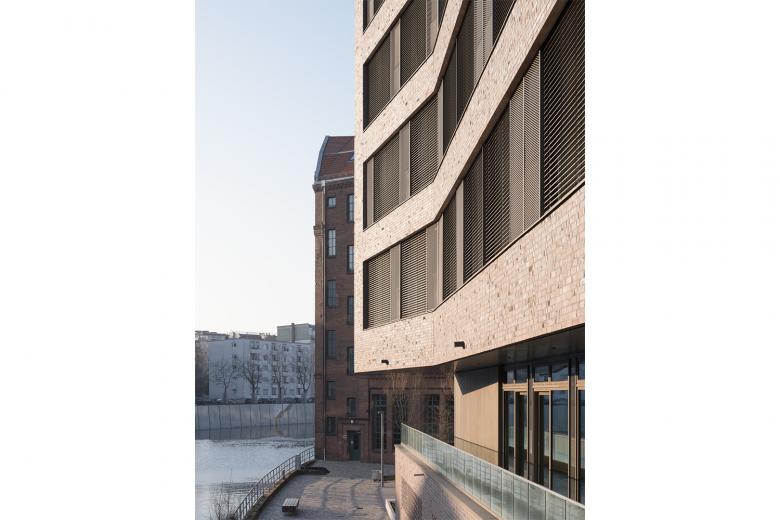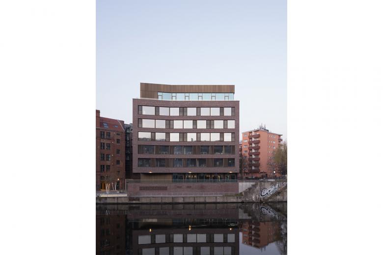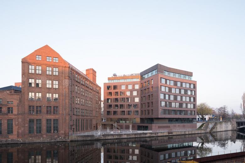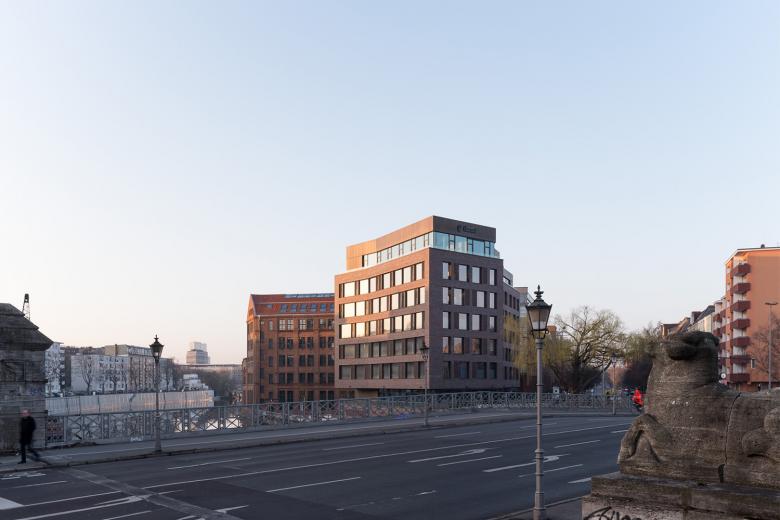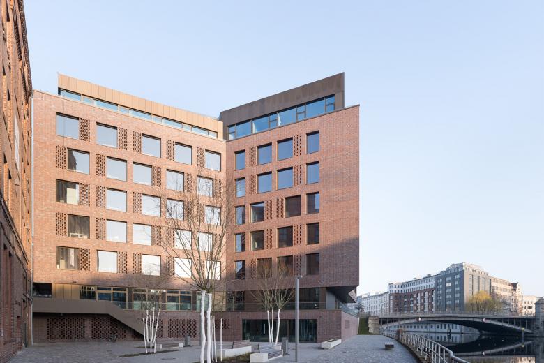 The Benjamin schließt als Eckbetonung ein altes Industrieareal, die Gebauer Höfe. Direkt an der Spree gelegen, forderte das Grundstück mit einer ungewöhnlichen Geometrie heraus. BFA schufen hier eine moderne Interpretation des Bestehenden. Als ästhetische Referenz gilt die umgebende, klassisch geklinkerte Industriearchitektur des denkmalgeschützen Ensembles. Wo im 19. Jahrhundert schwere Maschinen produziert wurden, schmiedet man heute Ideen und Gedanken. Im Inneren dominieren zeitgemäße Open Space-Arbeitsflächen, die einen kompletten Rundumblick ermöglichen. Fußgänger und Fahrradfahrerinnen genießen gleichermaßen das Ufer vor dem Eckgebäude.