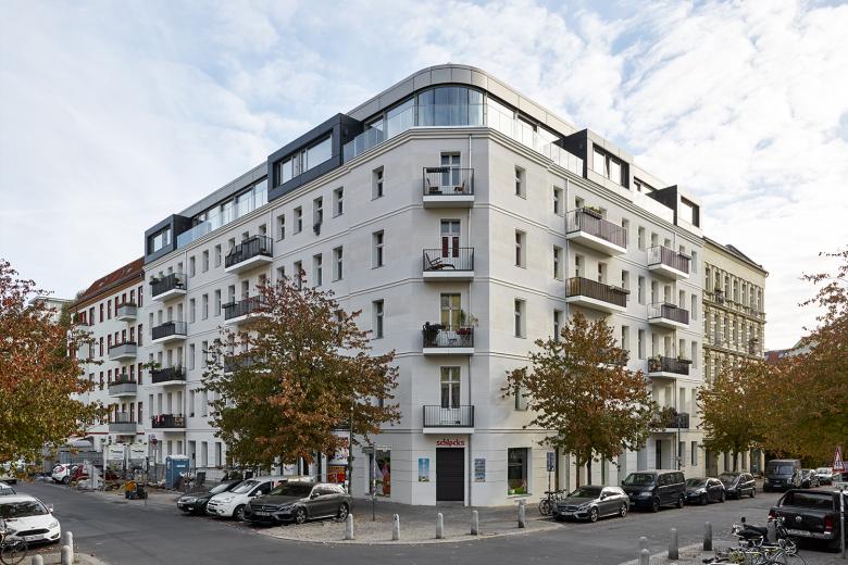 An der Winsstraße in Berlin-Prenzlauer Berg wurde ein klassischer Altbau komplett saniert. BFA hauchten dem Gebäude neues Leben ein und versetzten der Eckbebauung eine moderne Anmutung. Besonders hervorzuheben dabei ist das leicht nach hinten versetzte Dachgeschoss. Den umgebenden Dachschrägen wird damit ein fast vollumfänglich verglastes Staffelgeschoss zur Seite gestellt, das von kubisch hervortretenden Gauben dominiert wird. Dadurch entstanden großzügige moderne Dachgeschosswohnungen mit hochwertigem Ausbau und zeitgemäßem Charakter. Darüber hinaus erneuerte BFA die gesamte Fassade mit den Balkonen komplett und sanierte das Gebäude umfassend, auch technisch.